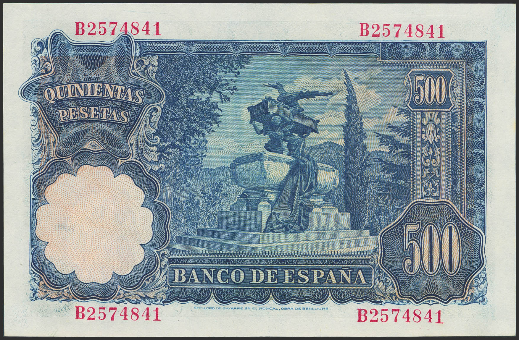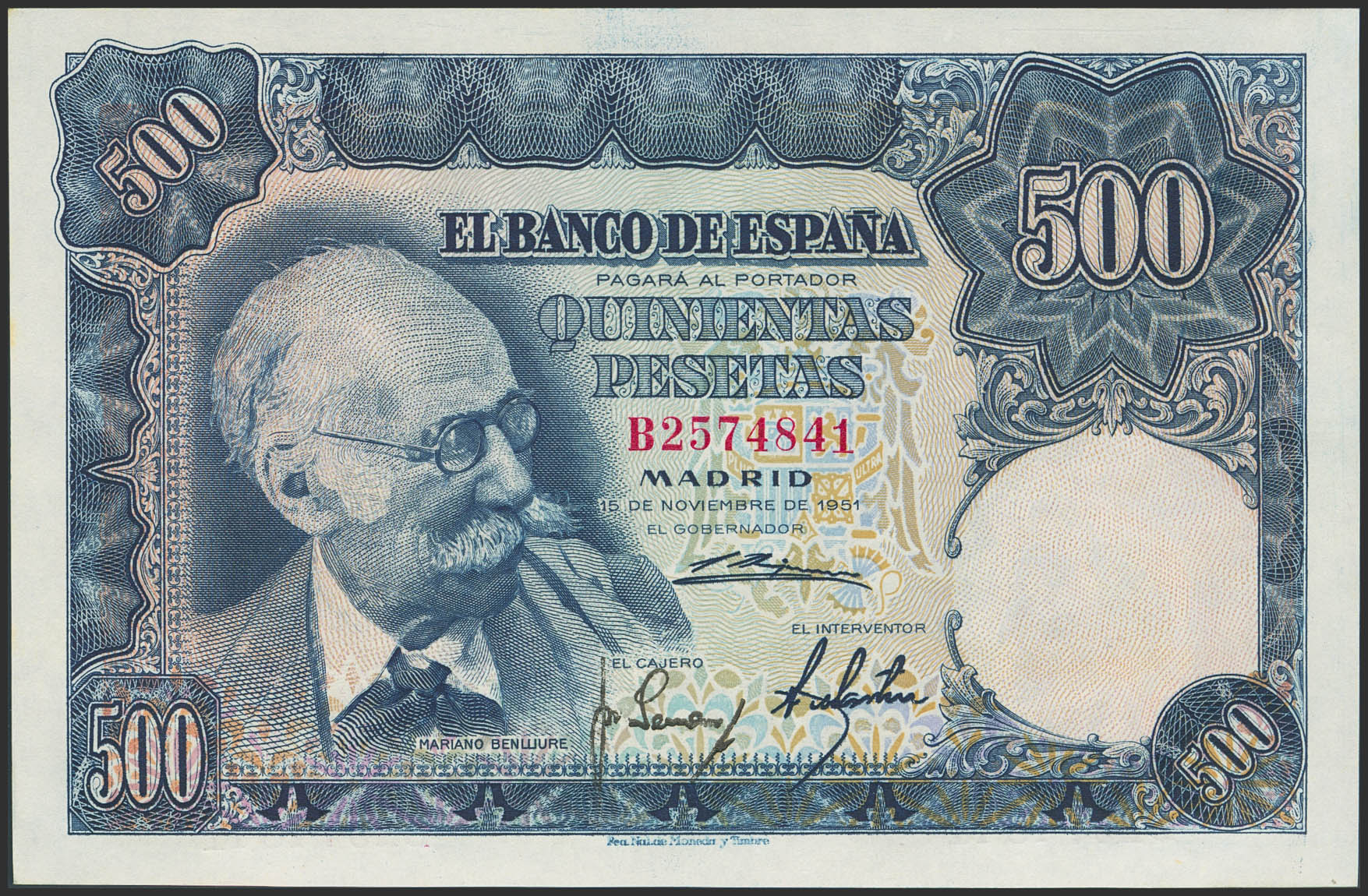 500 Pesetas. November 15, 1951. Series B. (Edifil 2023: 460a). Rare in this condition, original finish. Uncirculated.