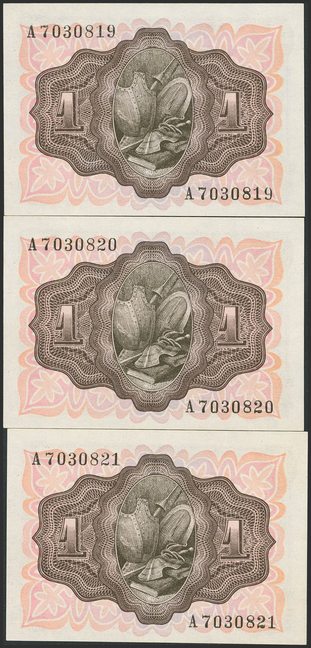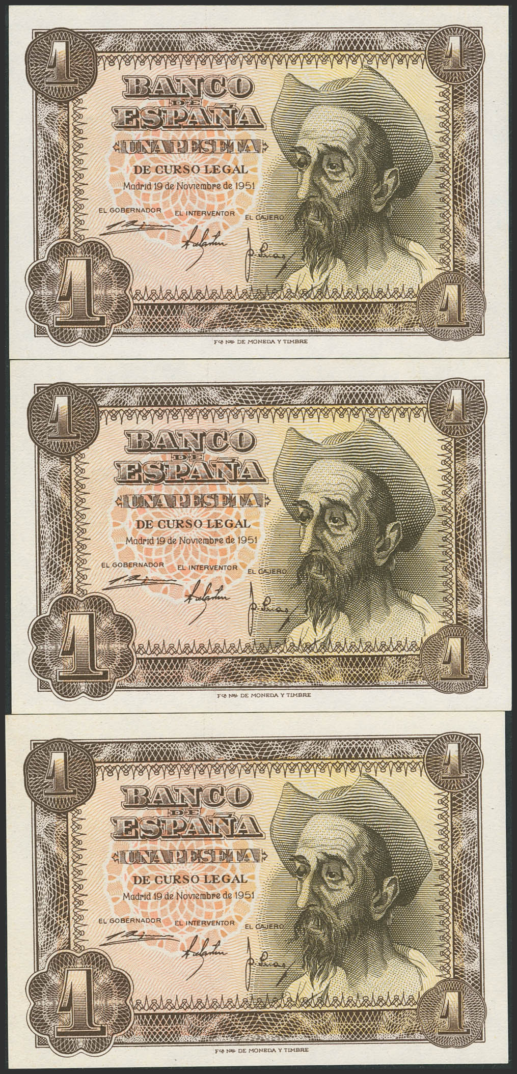 English 1 Peseta. November 19, 1951. Consecutive trio. Series A. (Edifil 2023: 461a). Original finish. Uncirculated.