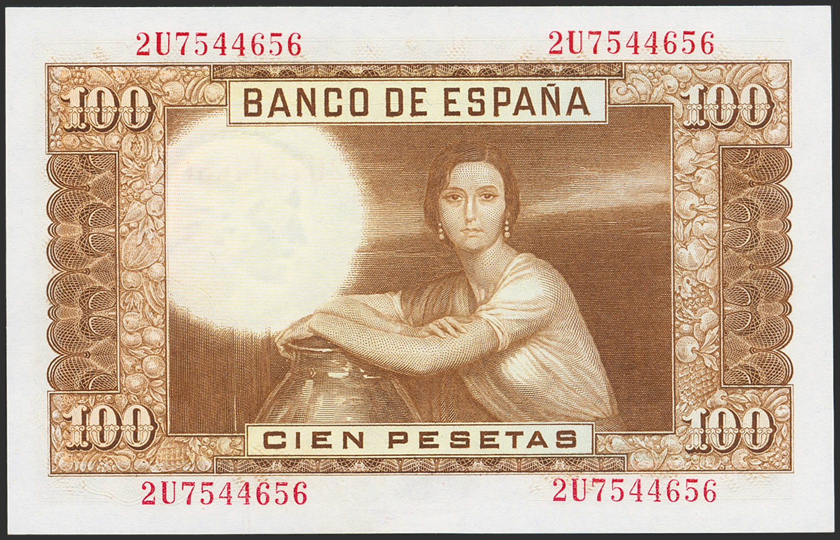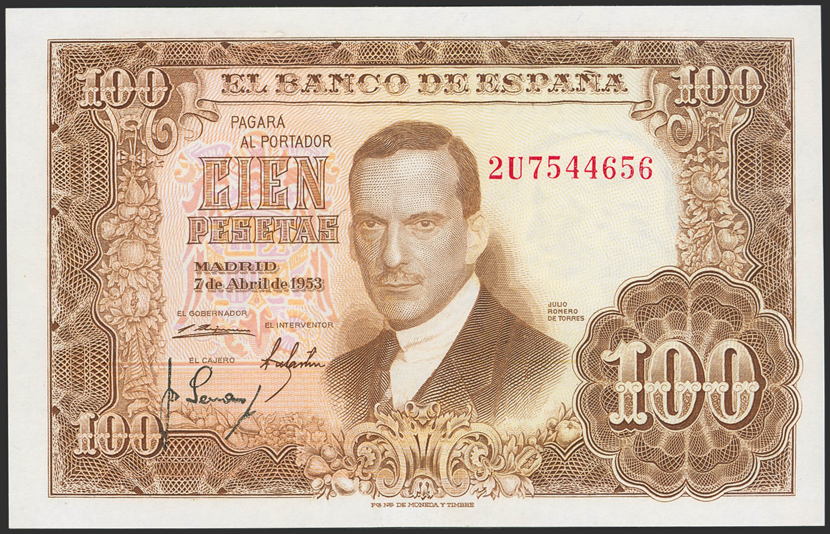 100 Pesetas. April 7, 1953. Series 2U. (Edifil 2023: 464c). Original finish. Uncirculated.