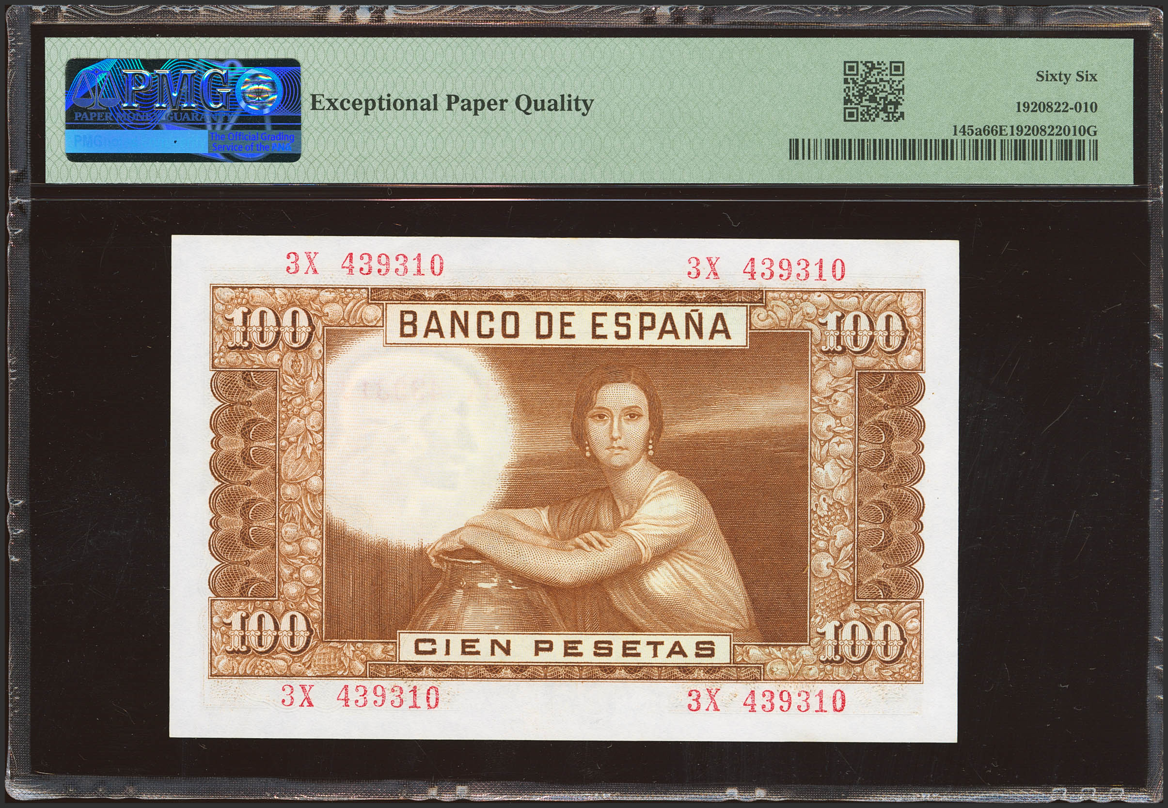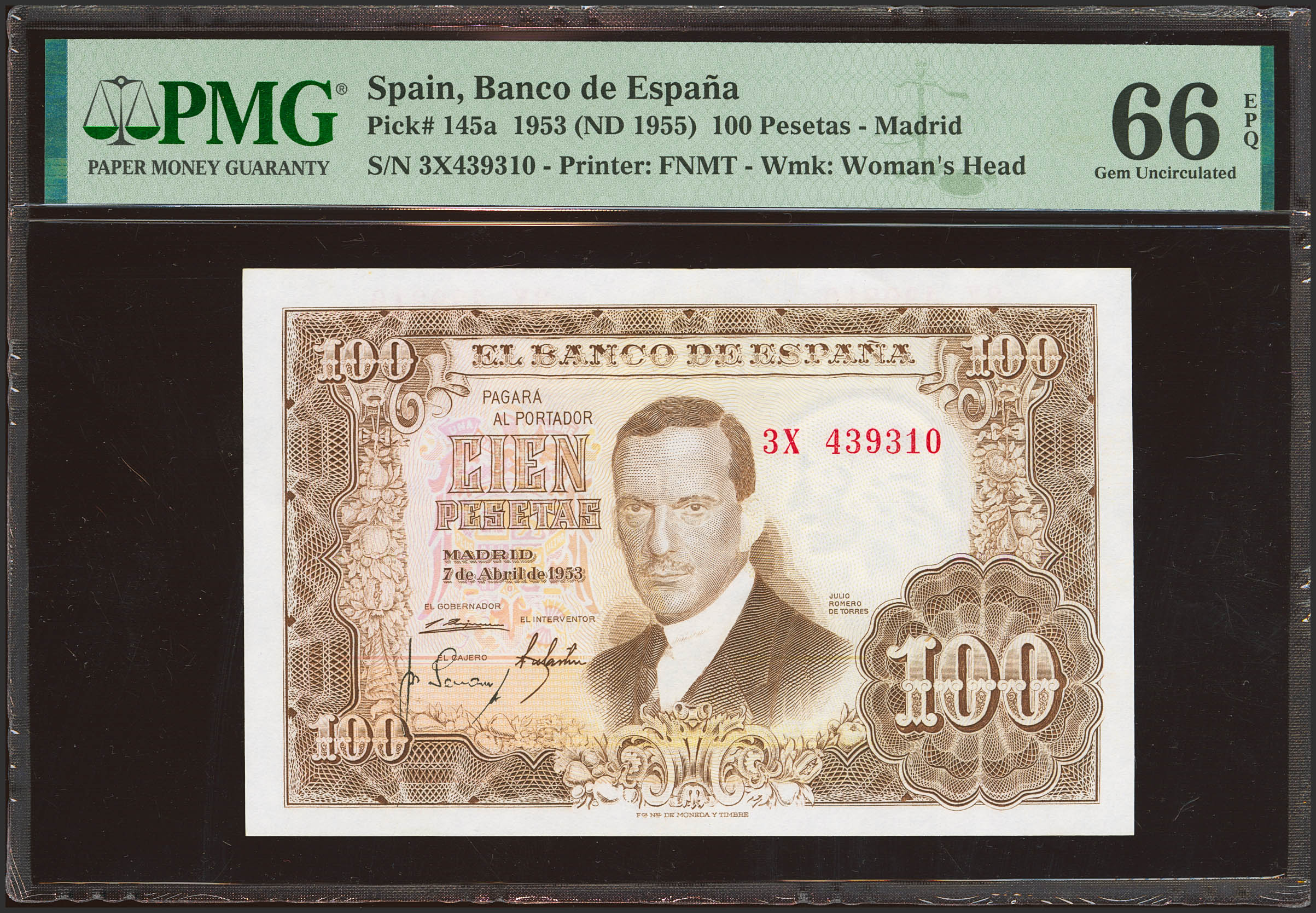 100 Pesetas. April 7, 1953. Series 3X, last series issued. (Edifil 2023: 464e, Pick: 145a). Very rare in this exceptional condition, original finish. Uncirculated. PMG66EPQ capsule.
