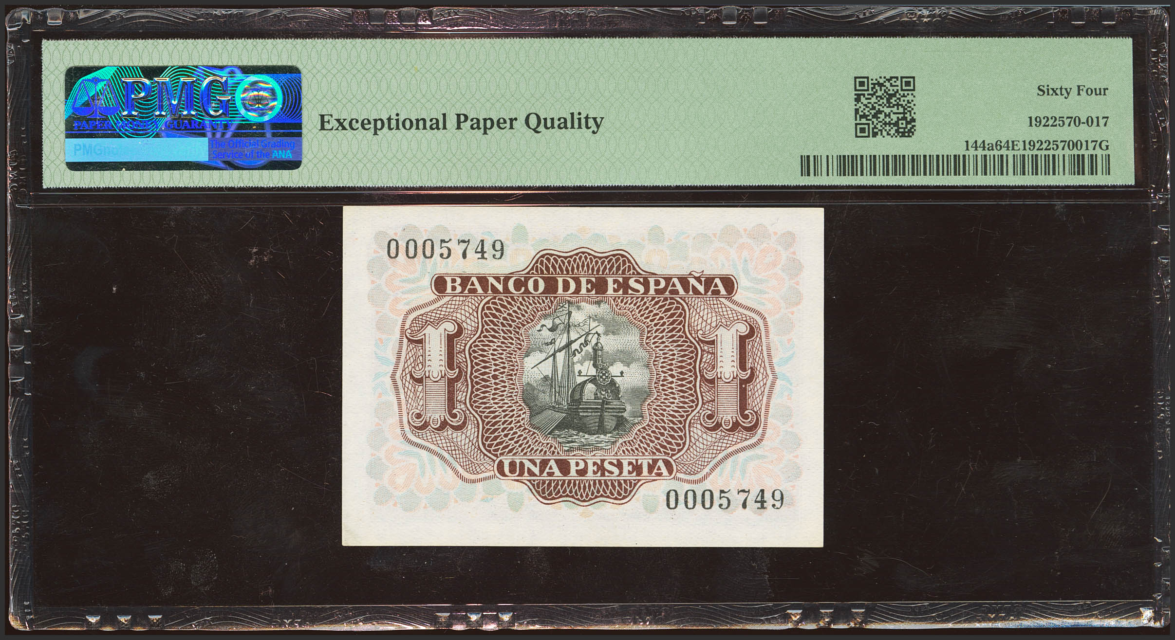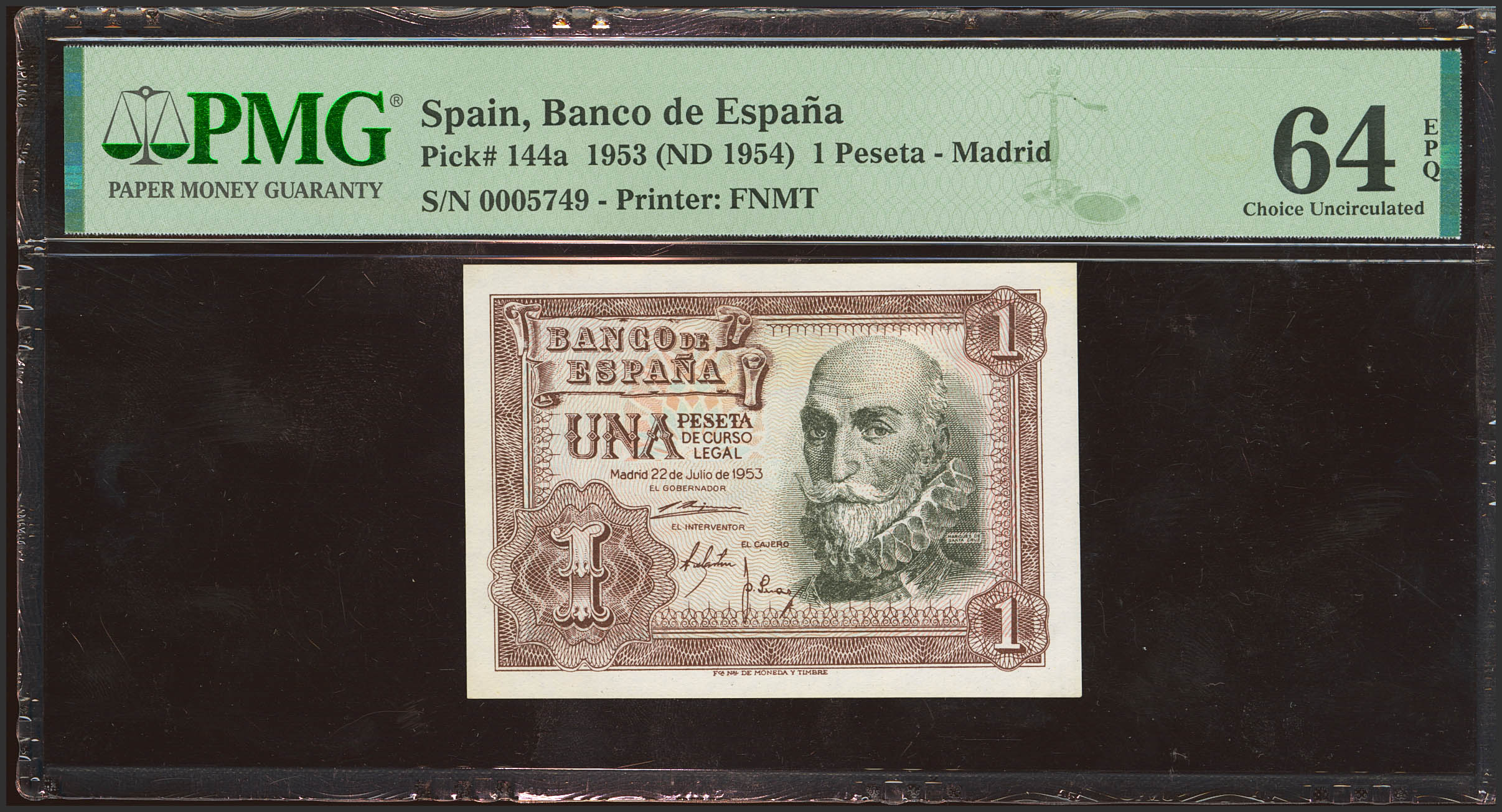 1 Peseta. July 22, 1953. No series and very low serial number. (Edifil 2023: 465, Pick: 144a). Original finish. Uncirculated. PMG64EPQ encapsulation.