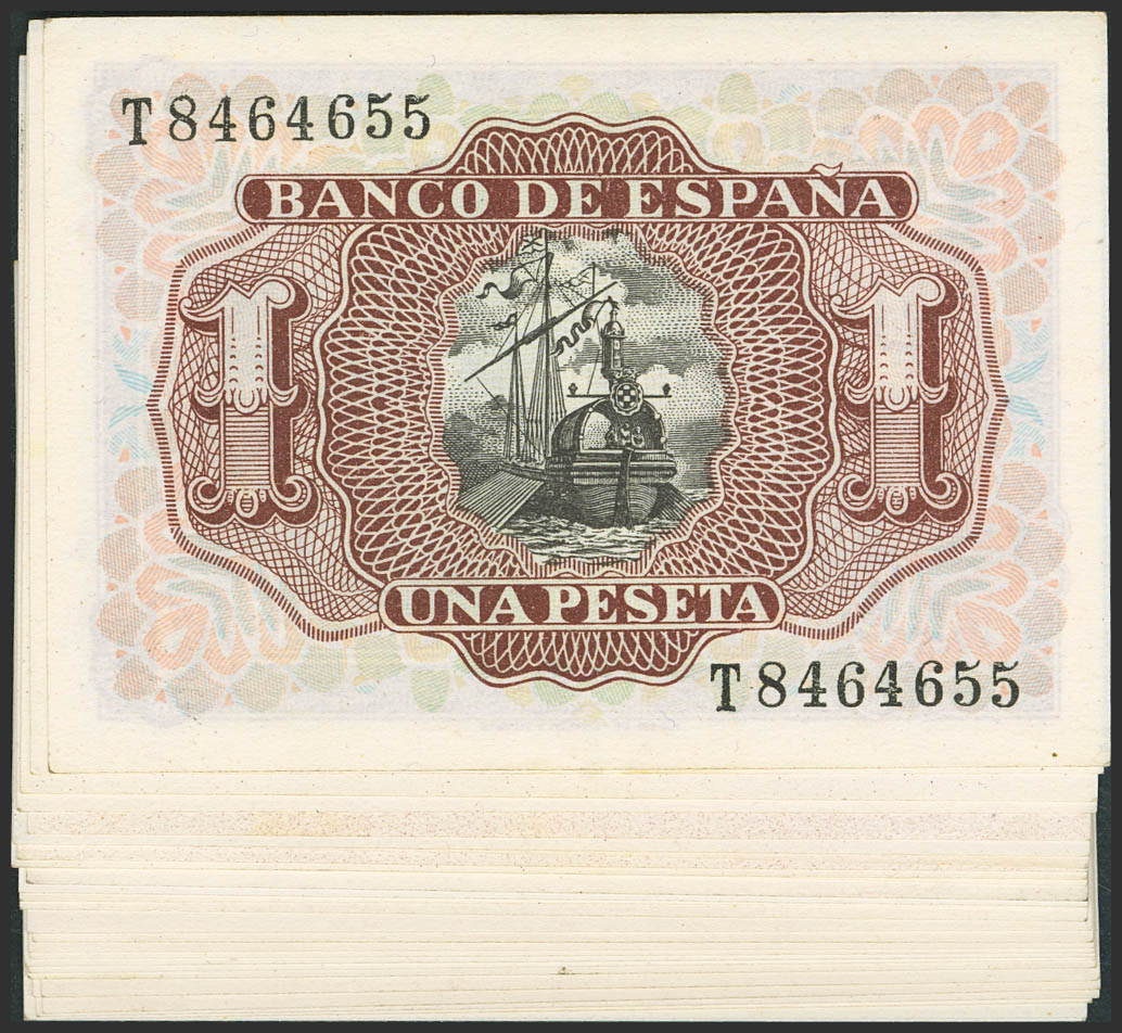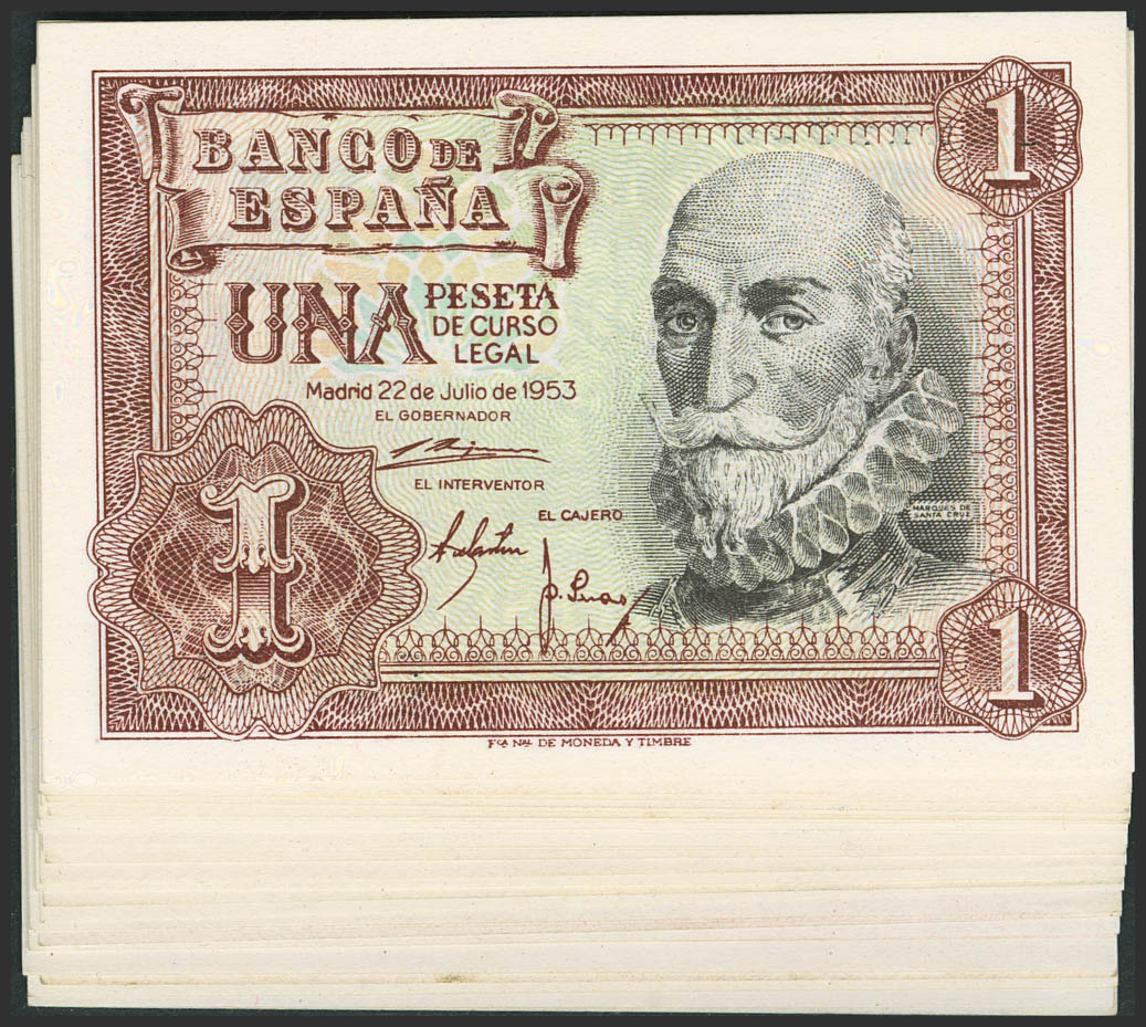 Set of 29 1 Peseta banknotes issued on July 2, 1953, with series E, G, I, N, T and 1D, respectively. (Edifil 2023: 465a). Uncirculated/Uncirculated-.