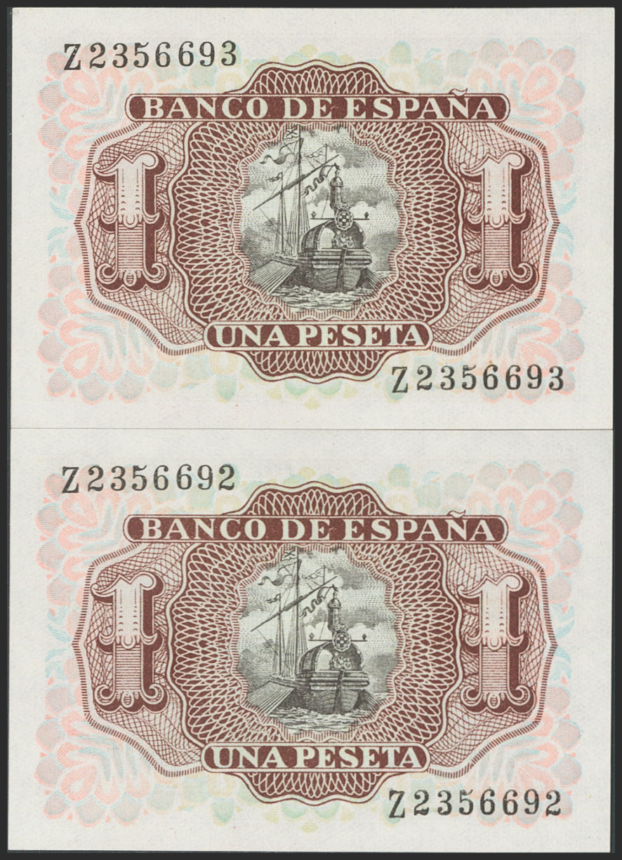 1 Peseta. July 22, 1953. Series Z, consecutive pair. (Edifil 2017: 465a). Uncirculated.
