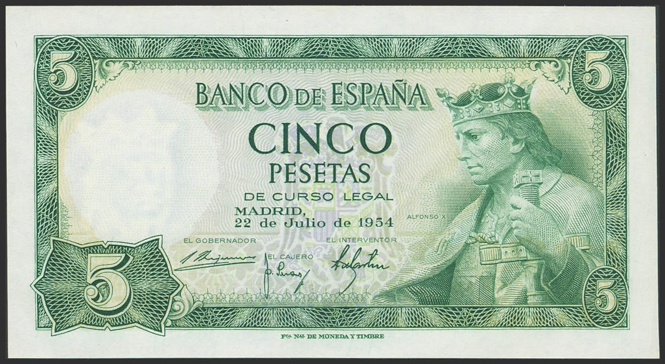 5 Pesetas. July 22, 1954. No series. (Edifil 2023: 466). Original finish. Uncirculated-.