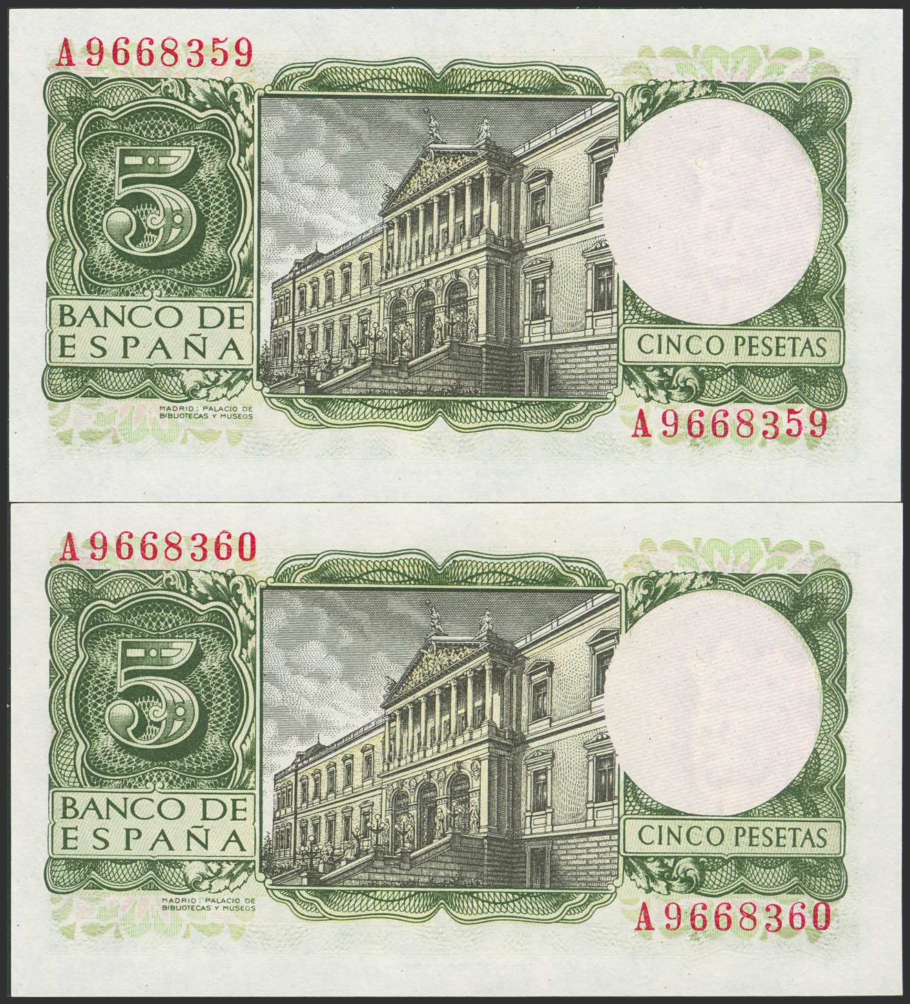 5 Pesetas. July 22, 1954. Consecutive pair. Series A. (Edifil 2023: 466a). Original finish. Uncirculated.