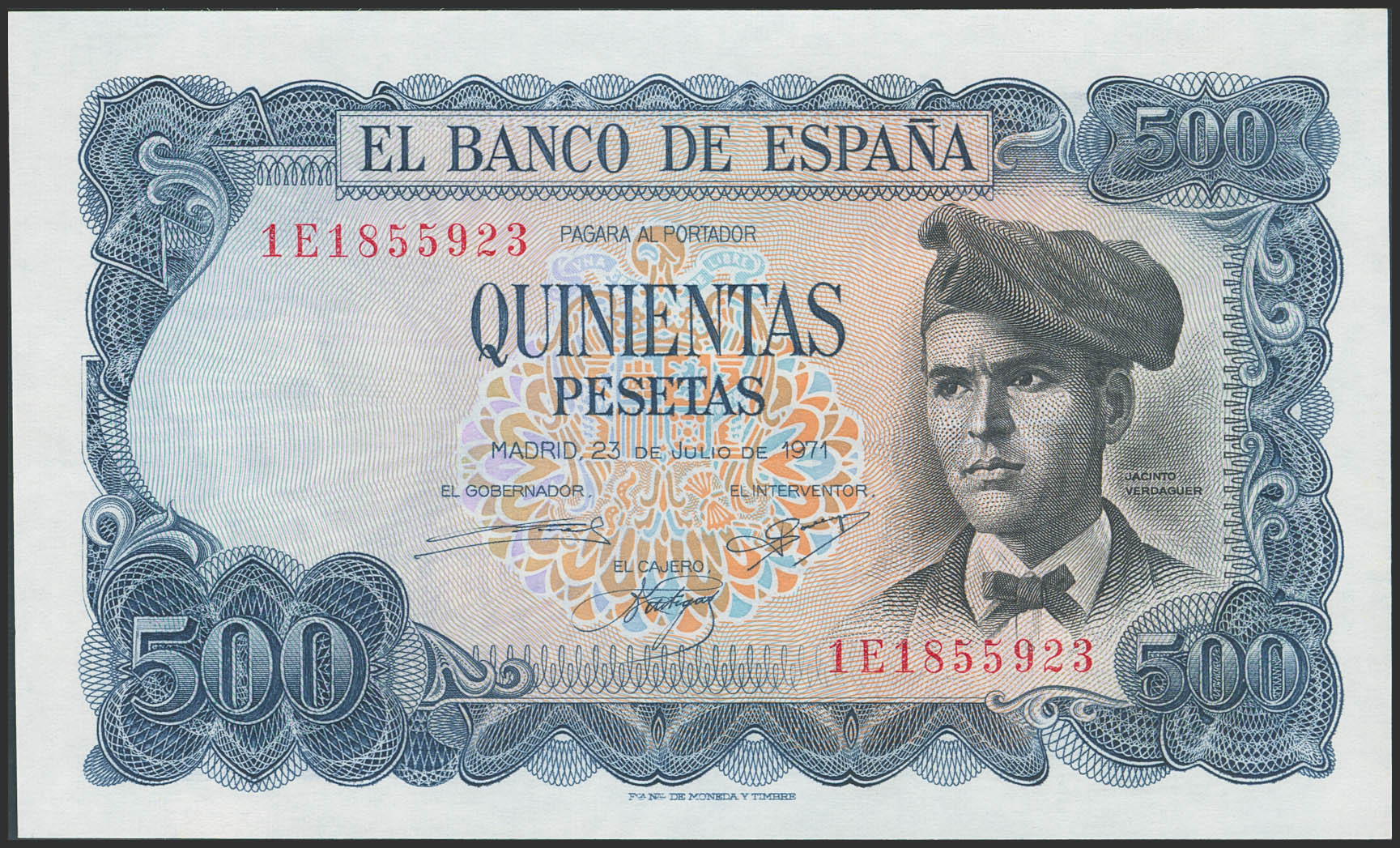 500 Pesetas. July 23, 1971. Series 1E. (Edifil 2023: 473a). Original finish. Uncirculated.