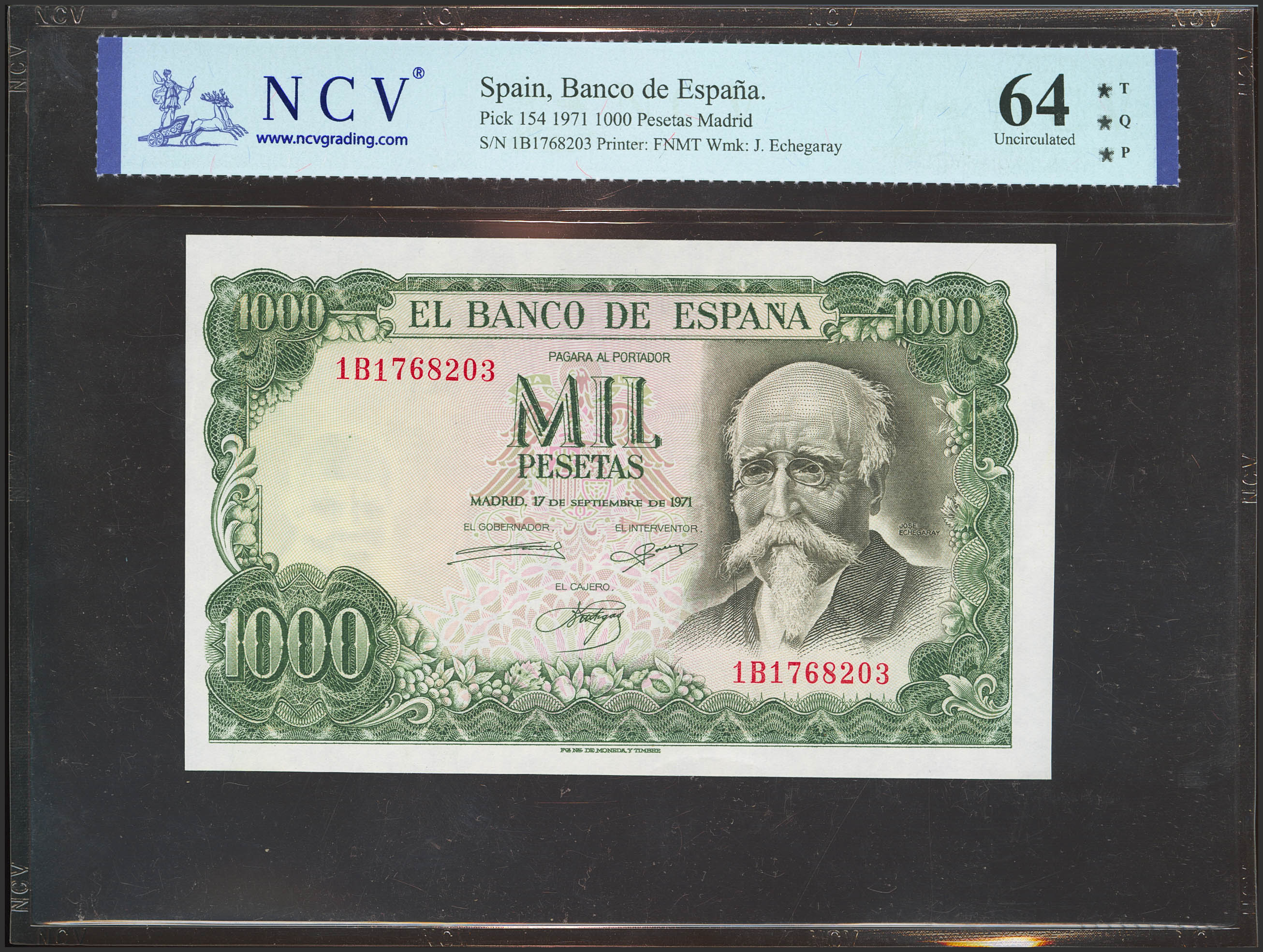 1000 Pesetas. September 17, 1971. Series 1B. (Edifil 2023: 474c, Pick: 154). Original finish. Uncirculated. NCV64TQP package.