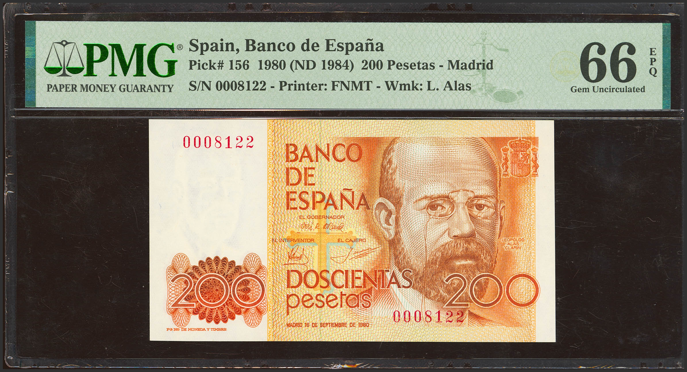 200 Pesetas. September 16, 1980. No series and low serial number. (Edifil 2023: 480, Pick: 156). Uncirculated. PMG66EPQ package.