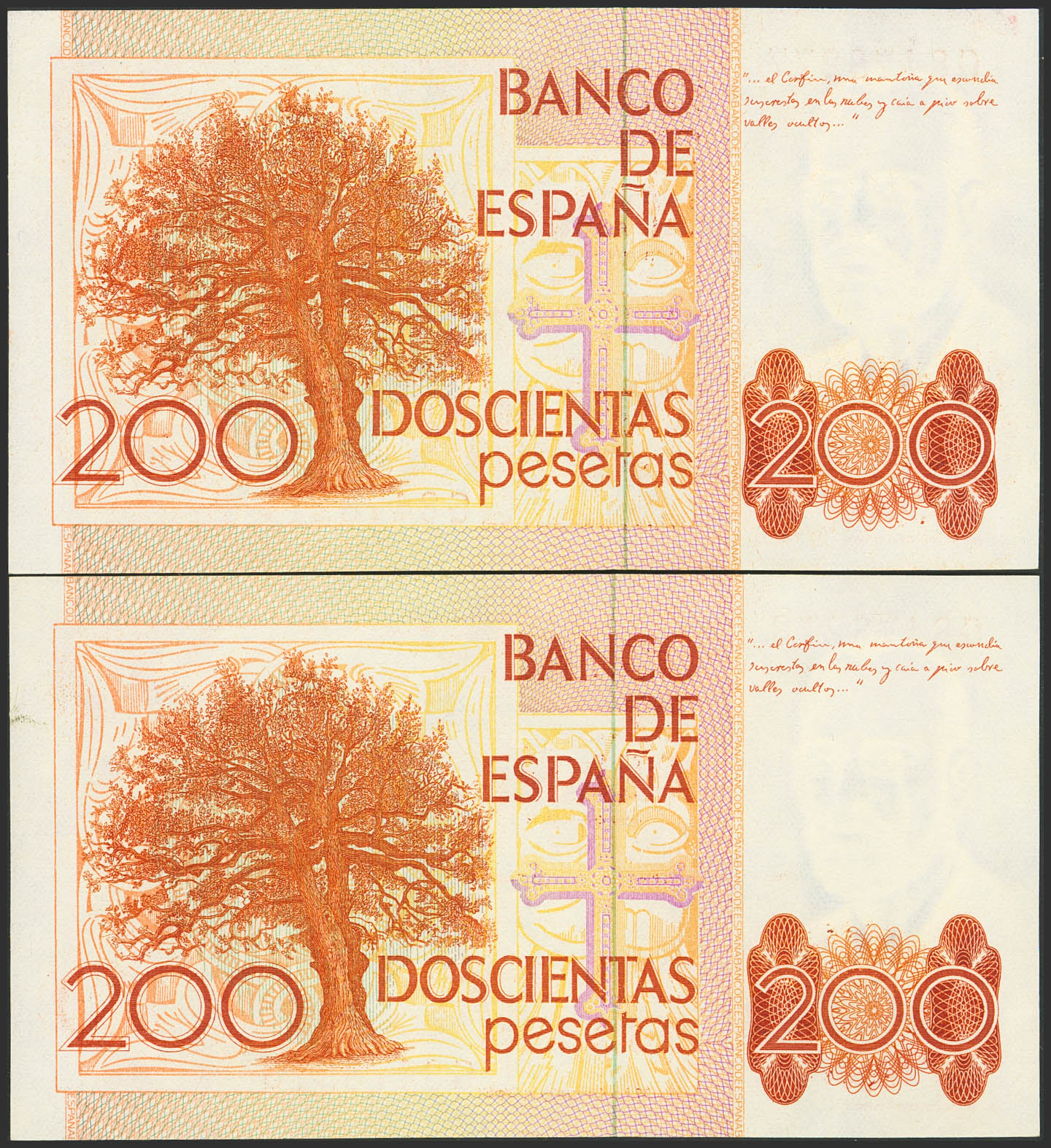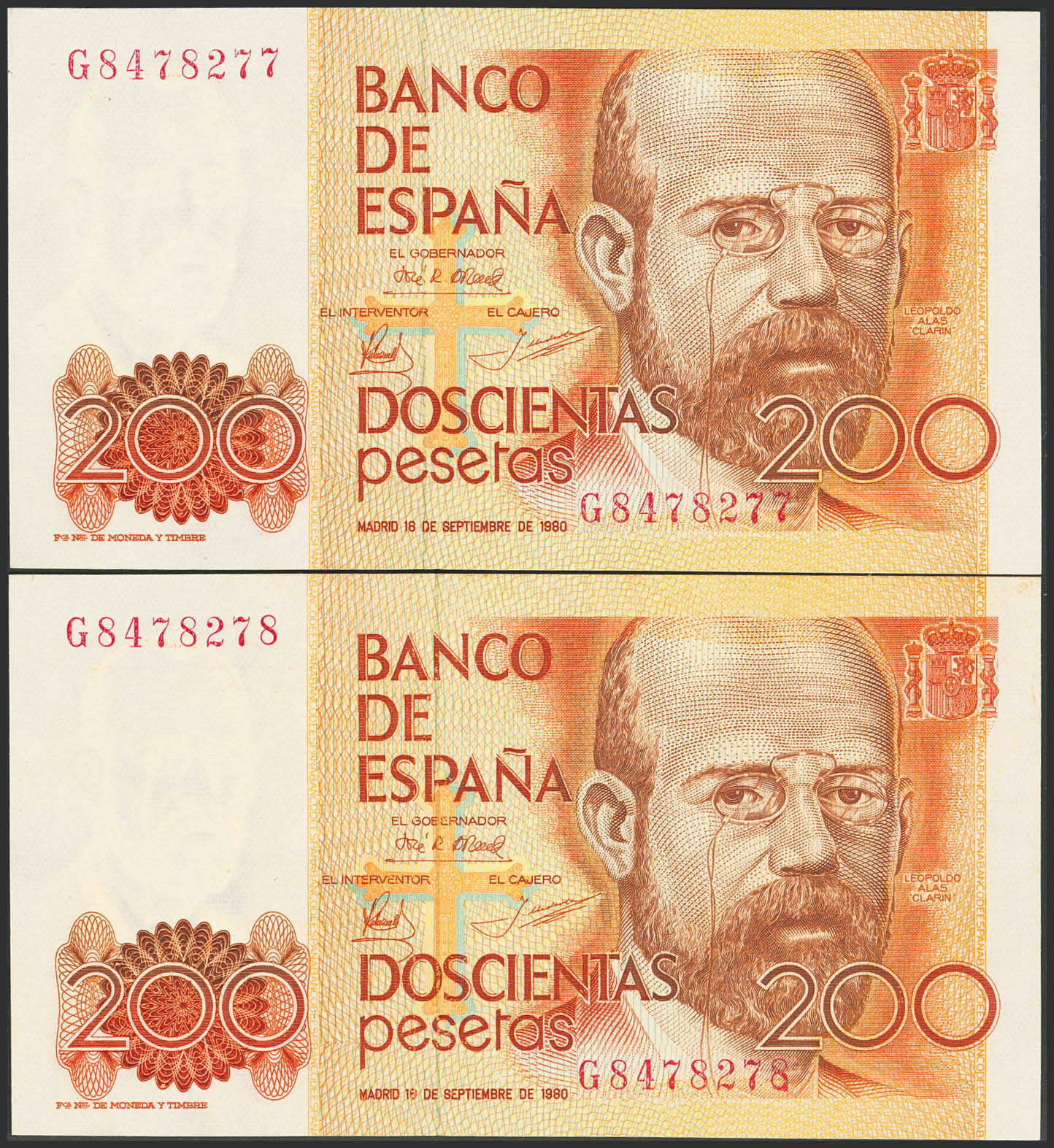 200 Pesetas. September 16, 1980. Consecutive pair. Series G. (Edifil 2023: 480a). Uncirculated.