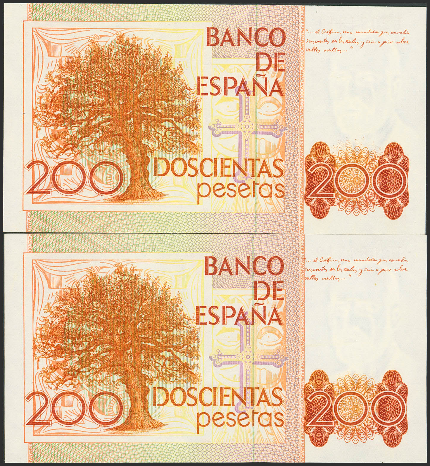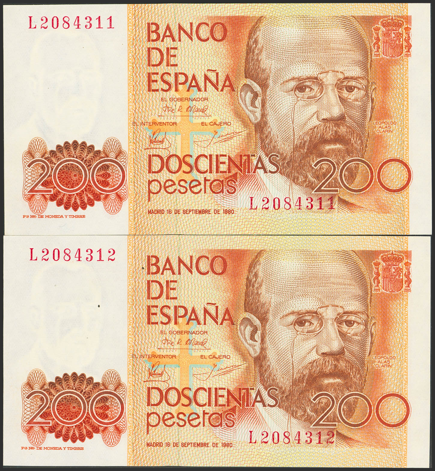 English 200 Pesetas. September 16, 1980. Consecutive pair. Series L. (Edifil 2023: 480a). Uncirculated.