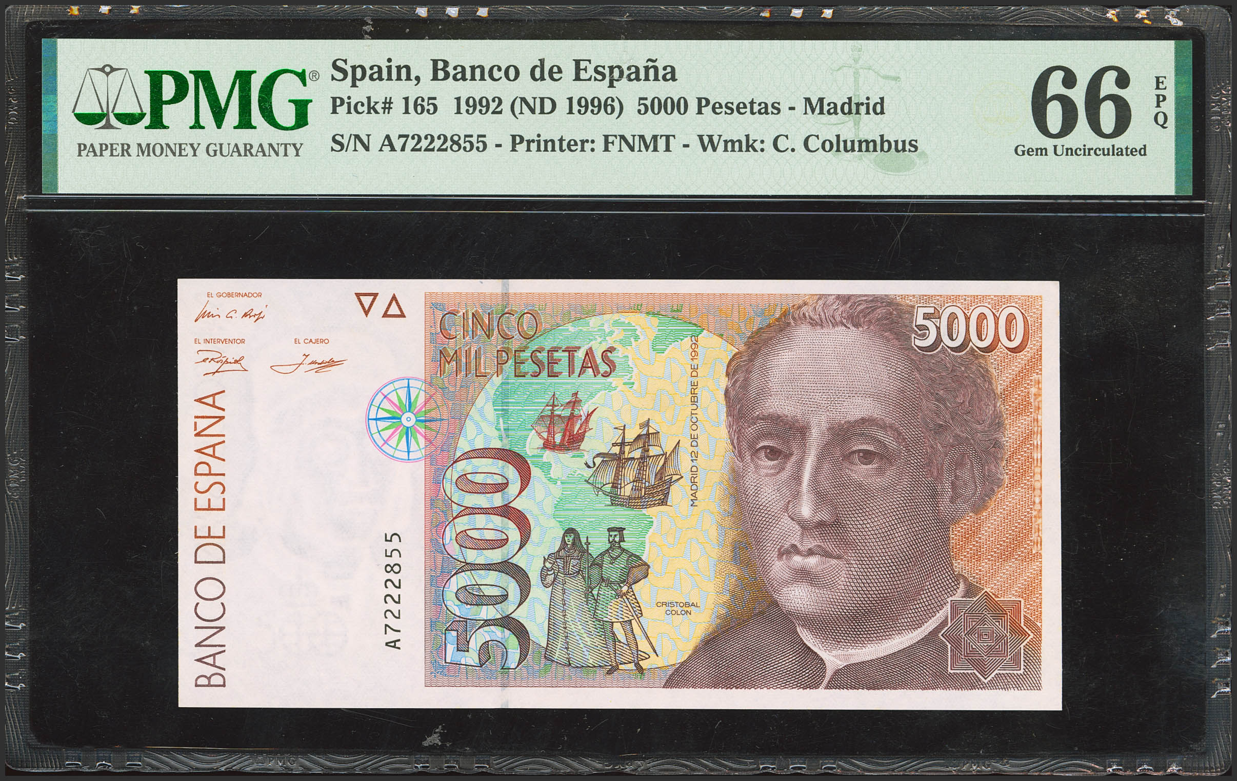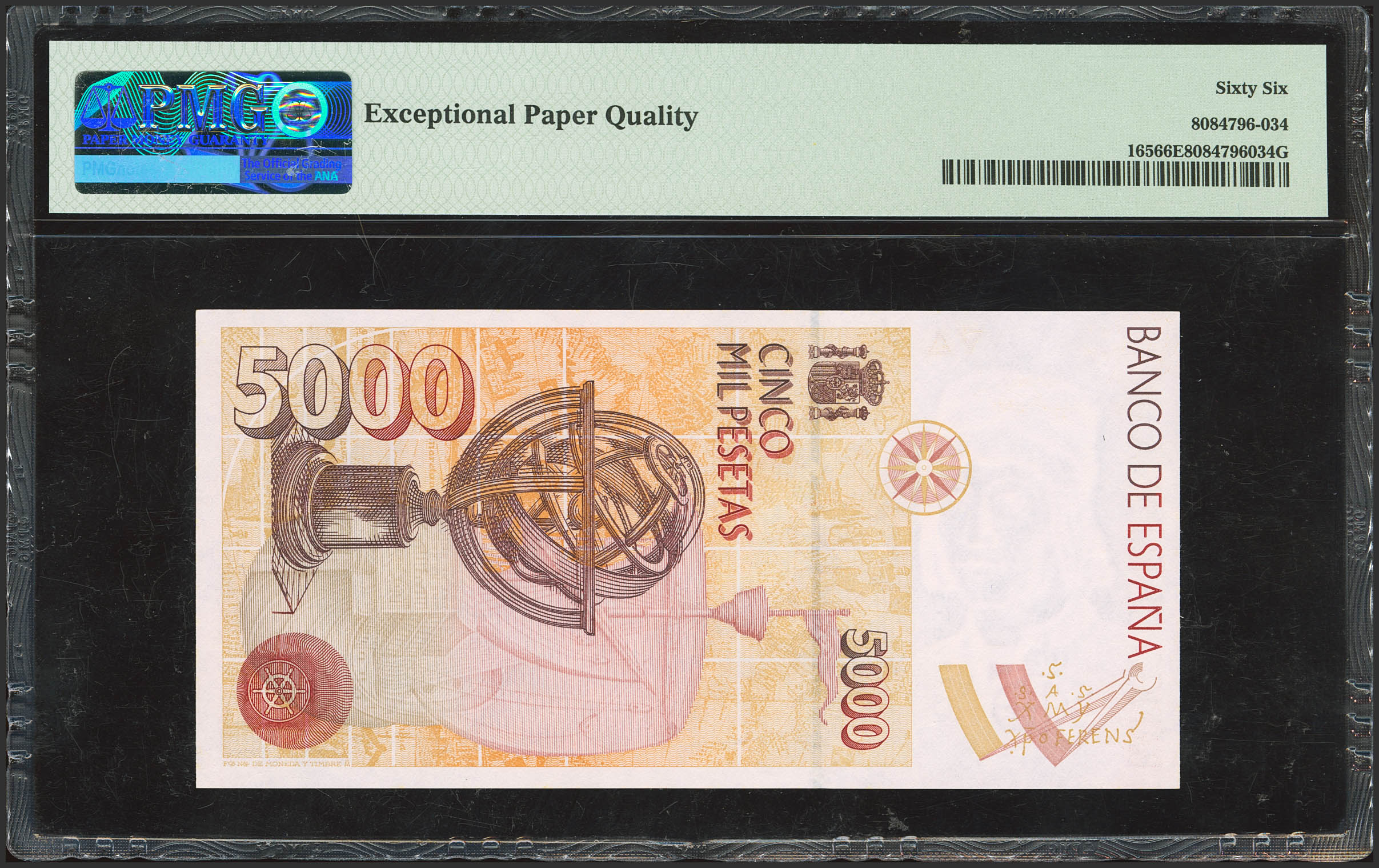 5000 Pesetas. October 12, 1992. Series A. (Edifil 2023: 484a, Pick: 165). Uncirculated. PMG66EPQ package.