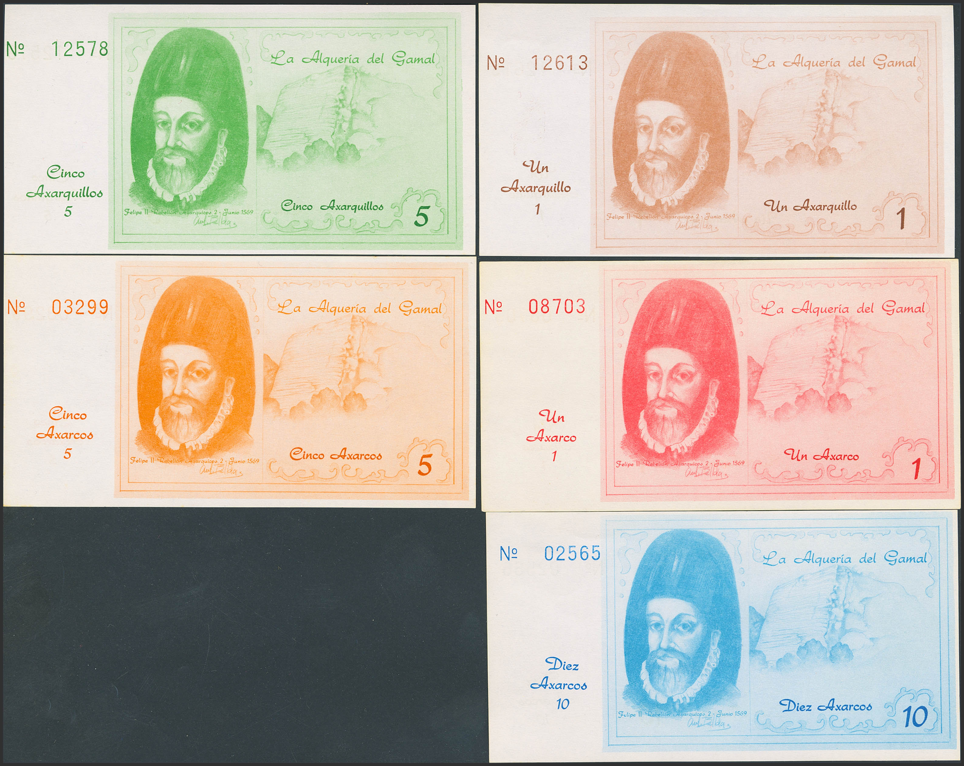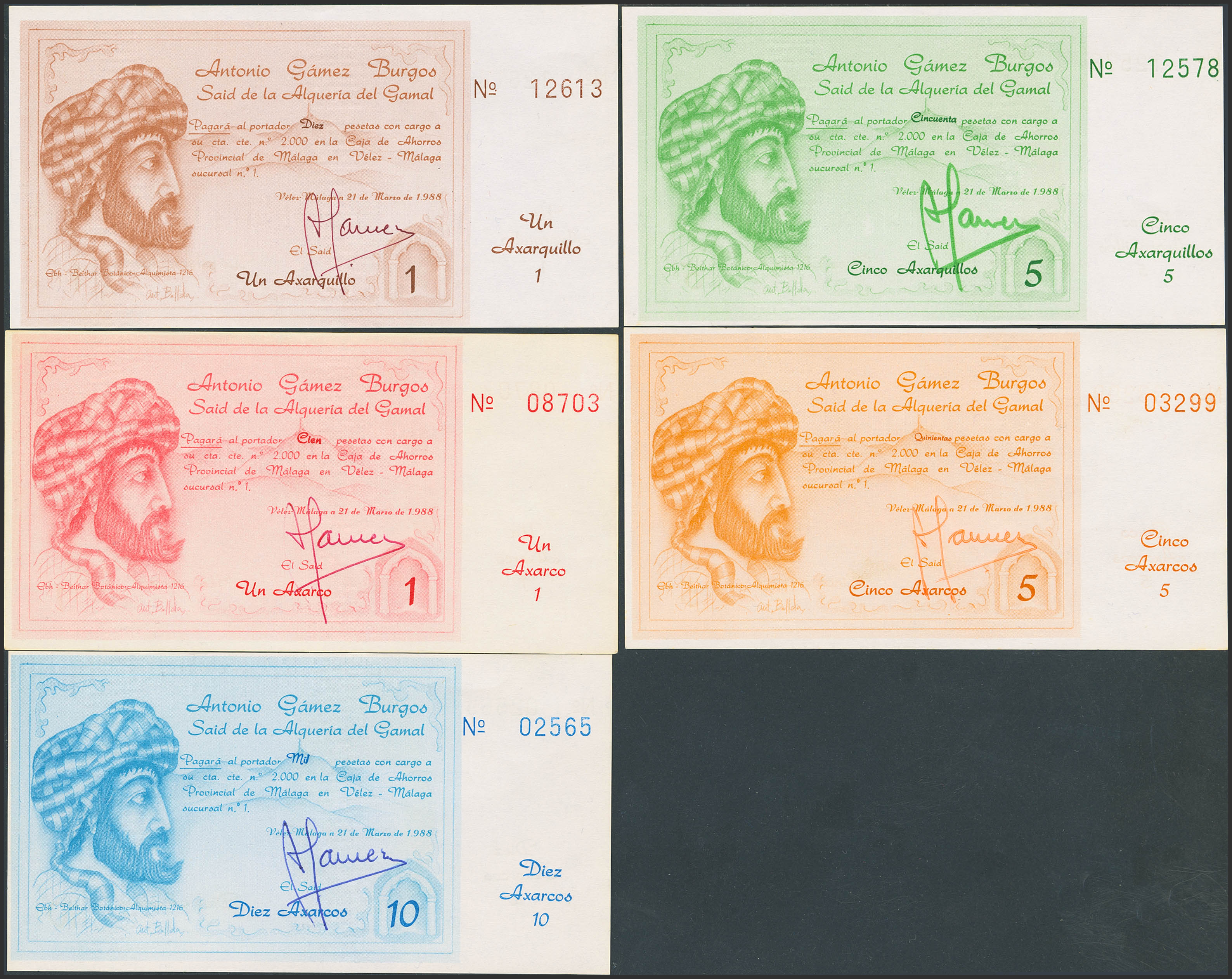 Series of 5 banknotes of 1 and 5 Axarquillos and of 1, 5 and 10 Axarcos. March 21, 1988. Vélez, Málaga. Antonio Gámez Burgos, Said de la Arquería de Gamal. Uncirculated.