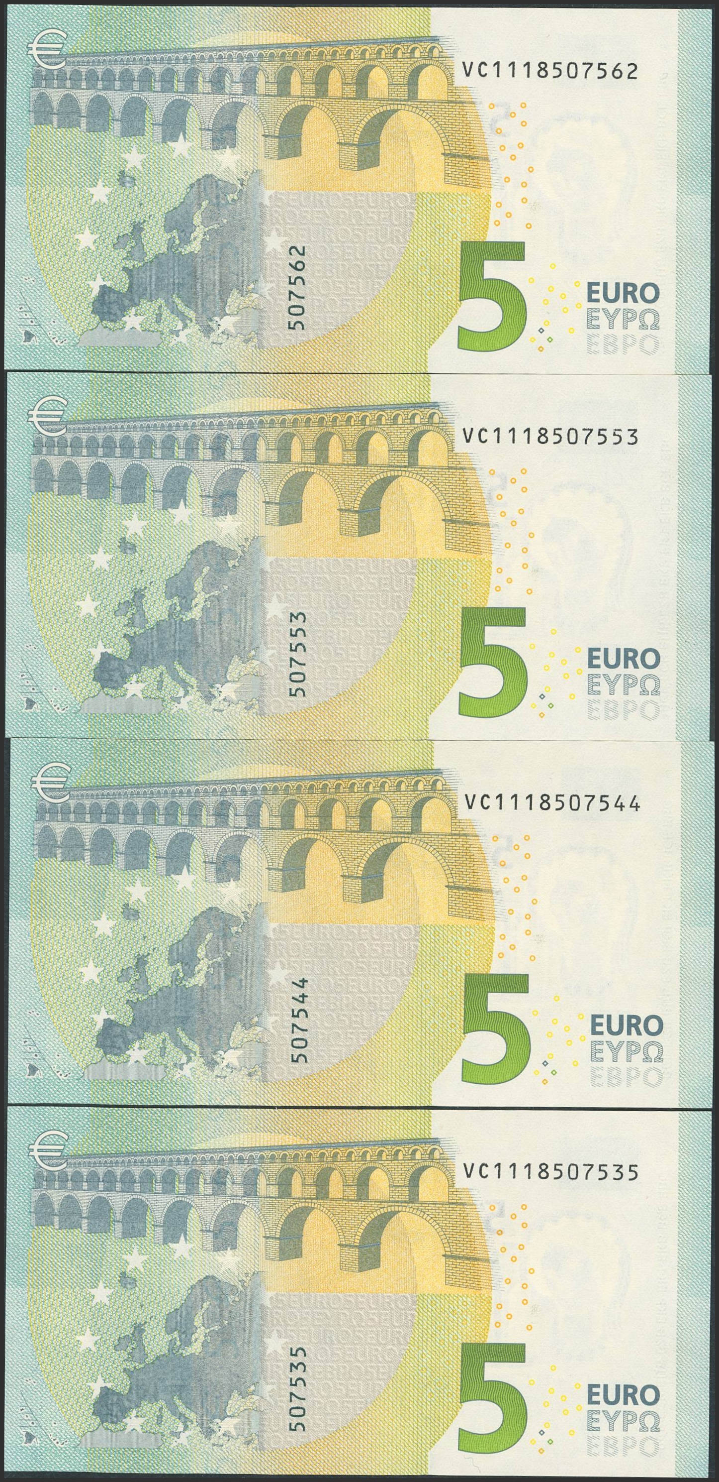 Set of 4 consecutive 5 Euro banknotes, issued on May 2, 2013 (it should be noted that the last digit of the serial number of all euro banknotes is for internal control by the European Central Bank; the penultimate digit indicates the serial number of the banknotes), with the signature of Lagarde and the series VC (Spain), (Edifil 2023: 493Aa). Uncirculated.