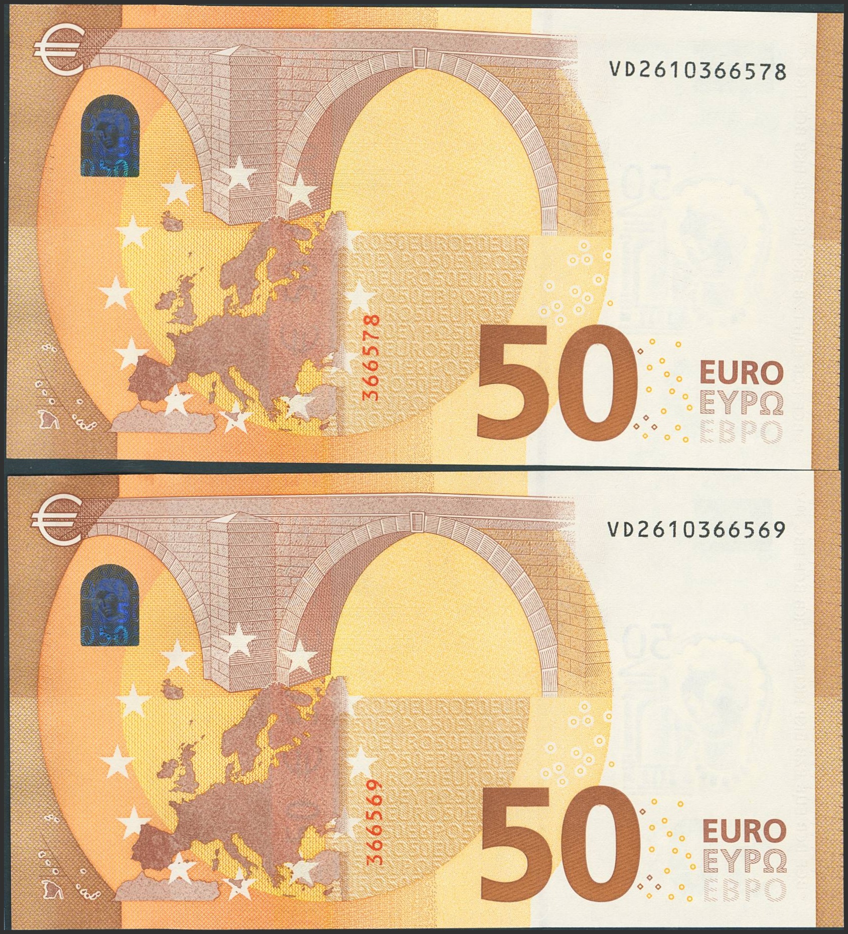 English 50 Euros. April 4, 2017. Consecutive pair (it should be noted that the last digit of all euro banknotes is for internal control by the European Central Bank; the penultimate digit is used to determine the serial number). Signature Lagarde. Series VD (Spain). (Edifil 2023: 496Ab). Uncirculated.