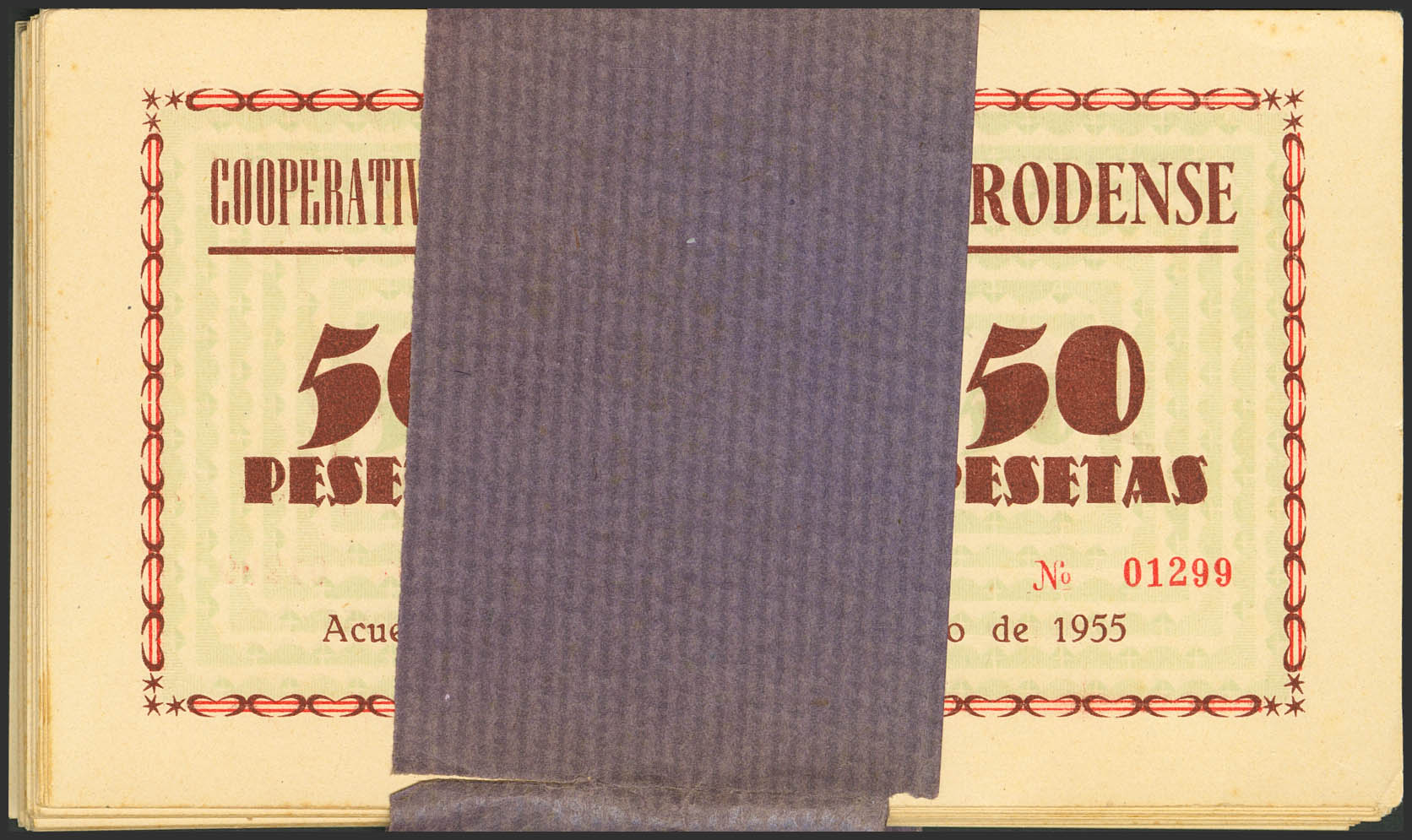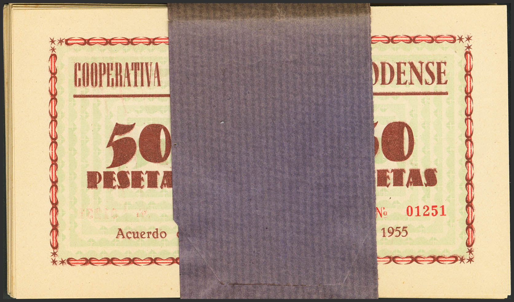 Set of 50 consecutive 50 Peseta banknotes issued by the LA PAZ RODENSE CONSUMER COOPERATIVE on January 22, 1955. Uncirculated-/Uncirculated.