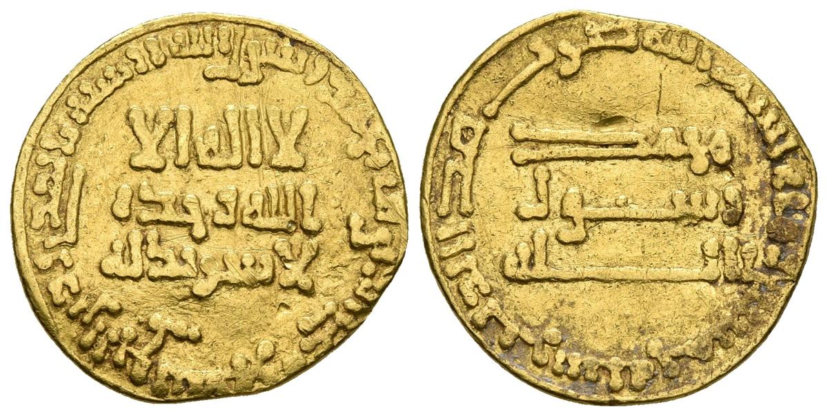 CALIFATO ABBASIDA. Al-Mansur. Dinar. 150 H. Sin ceca. SICA III 51. Au. 3,95g. Golpecito en reverso. MBC.Ex colección Edris Shir Mohammad. Colección de monedas de oro islámicas.