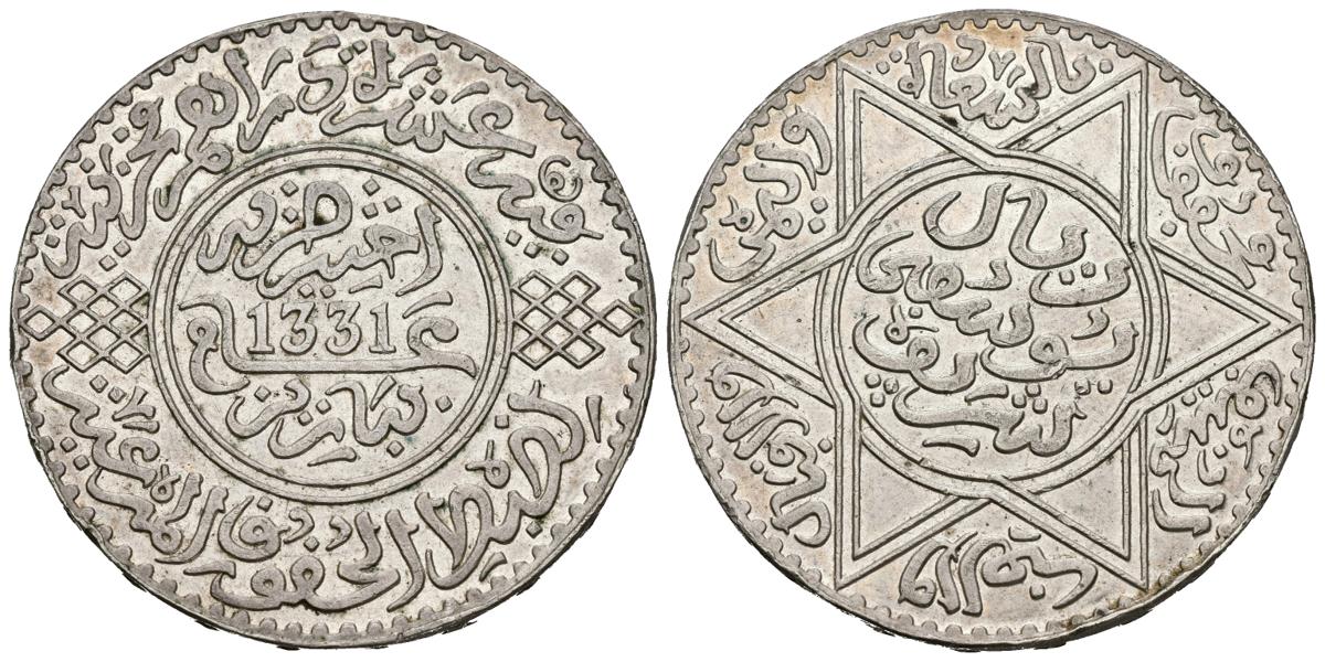 MARRUECOS. Abd Al-Aziz. 1 Rial ( 10 Dirhams). 1331 H-1912. Km#Y33. Ar. 24,99g. Leves golpecitos en el canto. EBC.