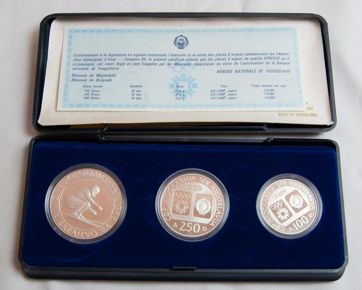 YUGOSLAVIA. Estuche conmemorativo de las olimpiadas de Sarajevo 1984, 500, 250 y 100 Dinara emitidos en 1982. Ar. SC. A EXAMINAR.