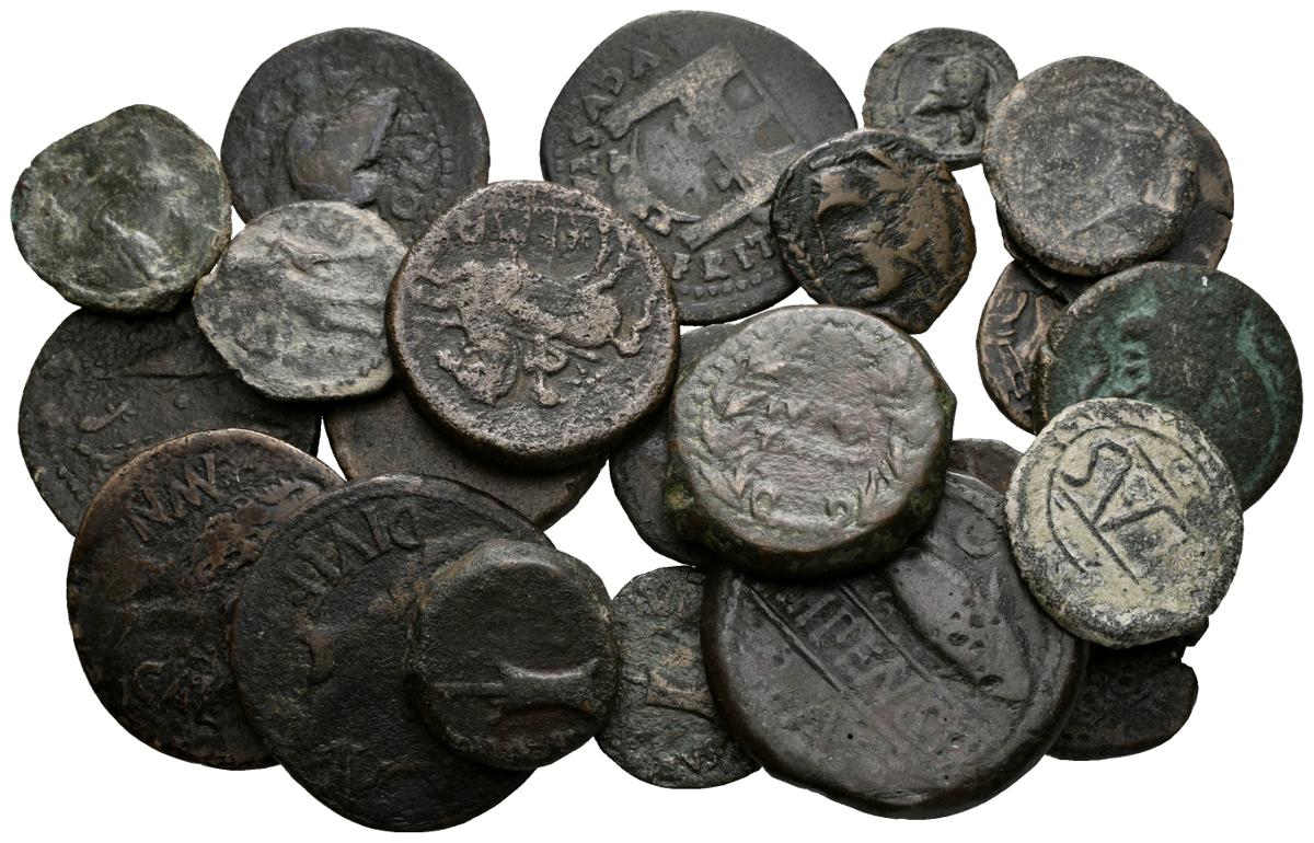 HISPANIA ANTIGUA. Lote compuesto por 23 monedas de bronce, conteniendo las cecas de Acinipo, Bolscan, Calagurris, Carisa, Cartagonova, Carteia, Cástulo, Celsa, Corduba, Emérita Augusta, Gades, Ilipense, Irippo, Ivlia Traducta, Lastigi, Malaca, Obulco, Searo y Secaisa. Ae. A EXAMINAR.