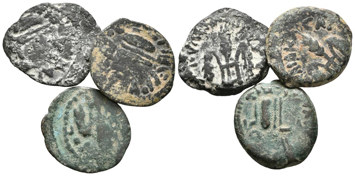 REVUELTAS JUDIAS. Lote compuesto por 3 Prutah acuñados por Poncio Pilatos. Meshorer 331; Hendin 1341; RPC I 4967. Ae. A EXAMINAR.