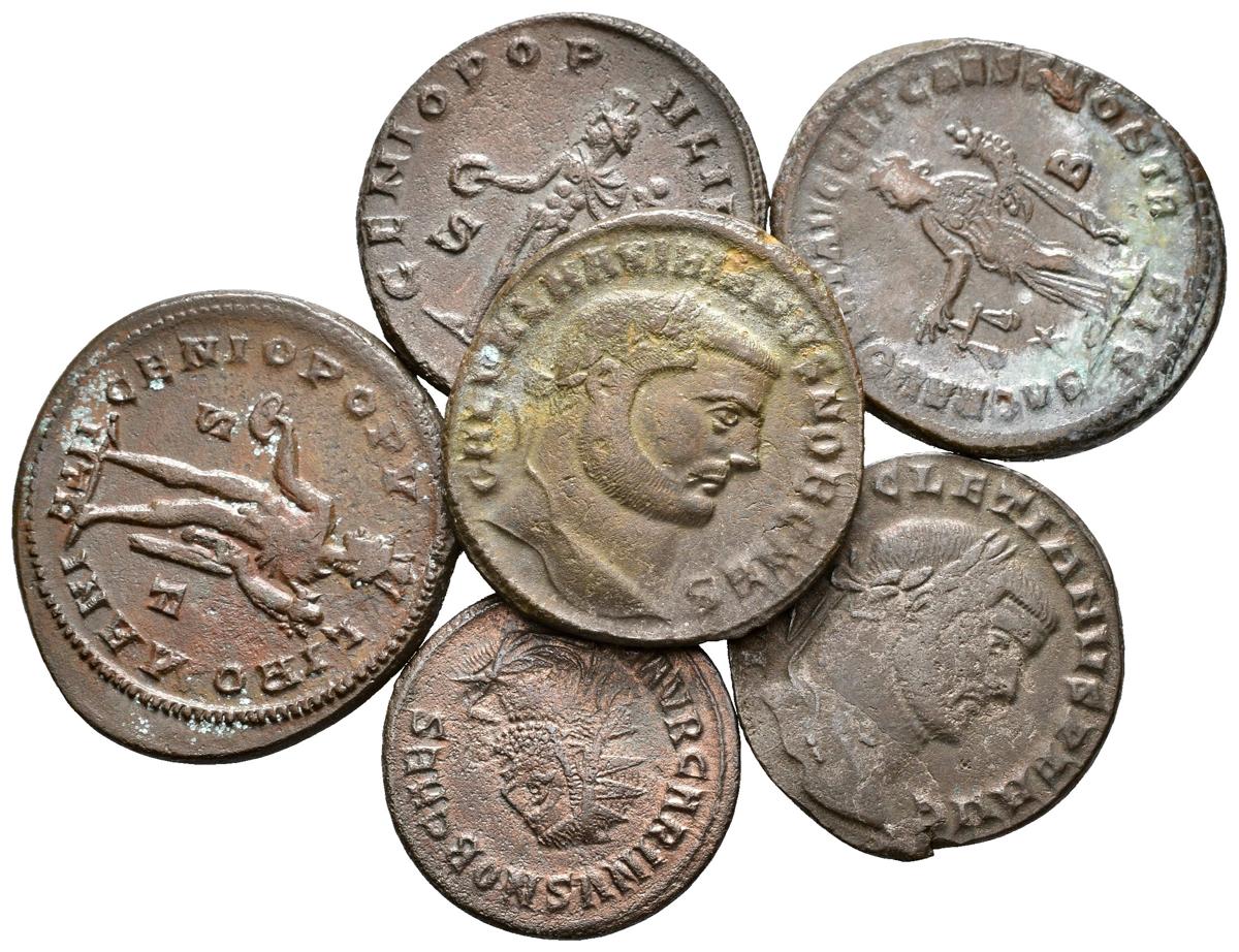 IMPERIO ROMANO. Lote compuesto por 6 monedas de bronce, conteniendo 5 Follis de Constancio, Galerio, Maximiano (2), Diocleciano y 1 Antoniniano de Carino. Diferentes reversos y cecas. Ae. MBC-/MBC. A EXAMINAR.