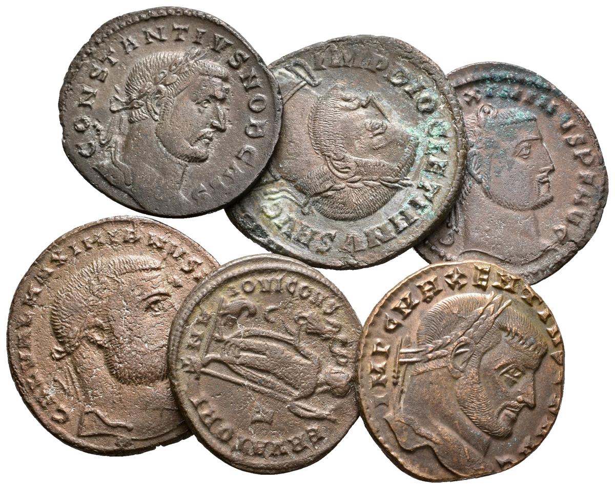 IMPERIO ROMANO. Lote compuesto por 6 Follis de Constancio, Galerio (3), Diocleciano y Majencio. Diferentes reversos y cecas. Ae. MBC-/MBC. A EXAMINAR.