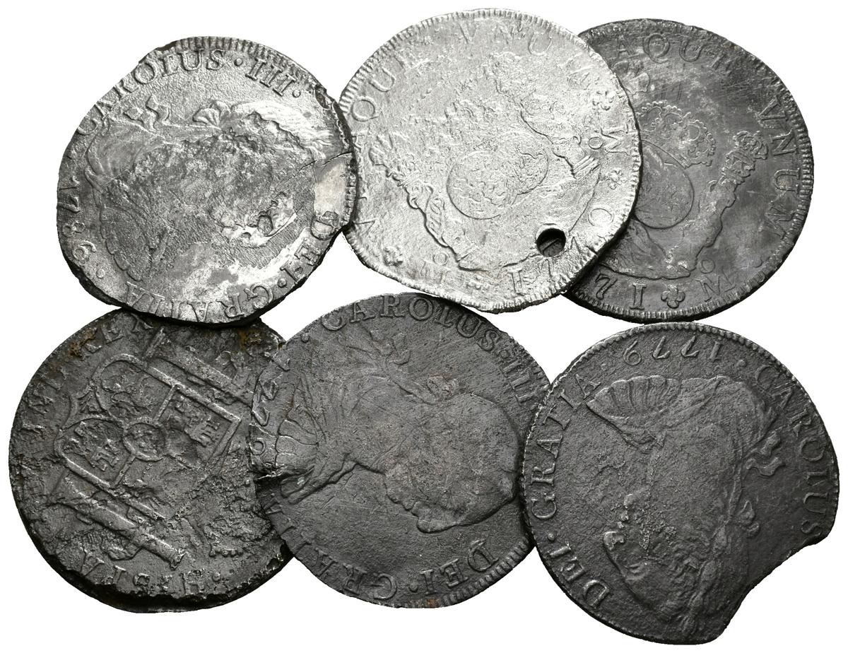 CARLOS III. Lote compuesto por 6 monedas de 8 Reales, conteniendo: 1770 México MF (columnario); 1771 México MF (columnario); 1789 México FM; 1772 México FM (ensayadores invertidos); 1779 México FF y 1786 México FM. Todas presentan oxidaciones marinas. Ar. A EXAMINAR.