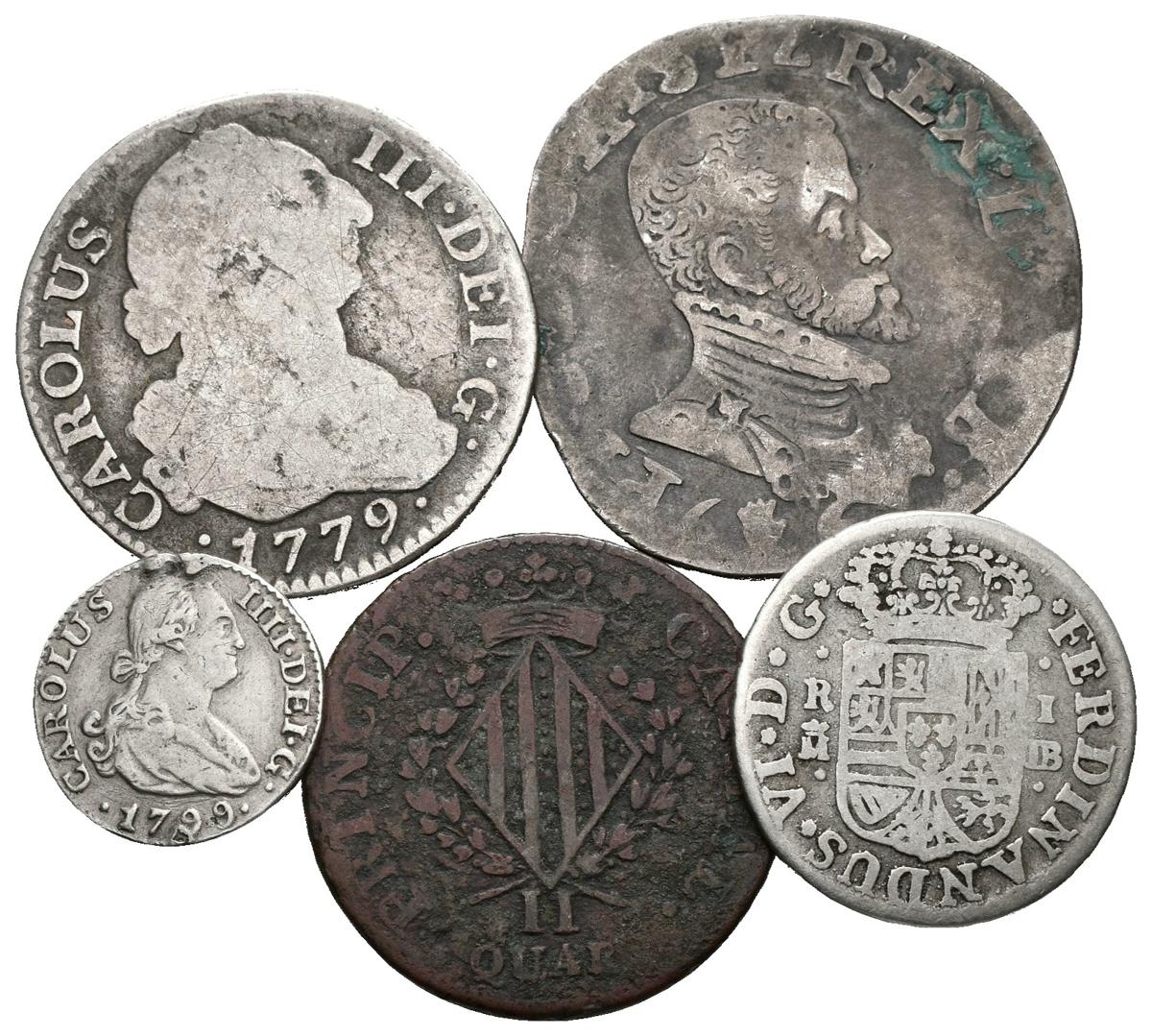 MONARQUIA ESPAÑOLA. Lote compuesto por 5 monedas de los reyes, Felipe II, Fernando VI, Carlos III, Carlos IV y Fernando VII. BC/MBC. A EXAMINAR.