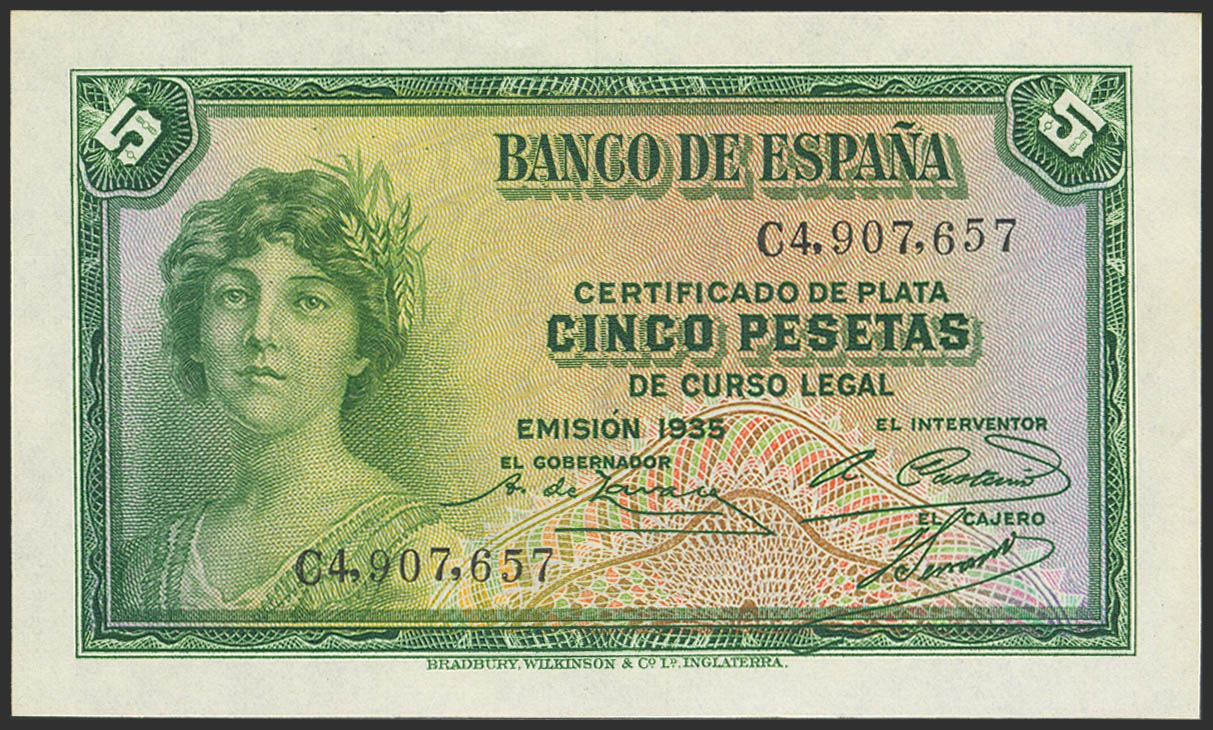 5 Pesetas. 1935. Silver Certificate. Series C. (Edifil 2023: 363a). Original finish. Uncirculated.