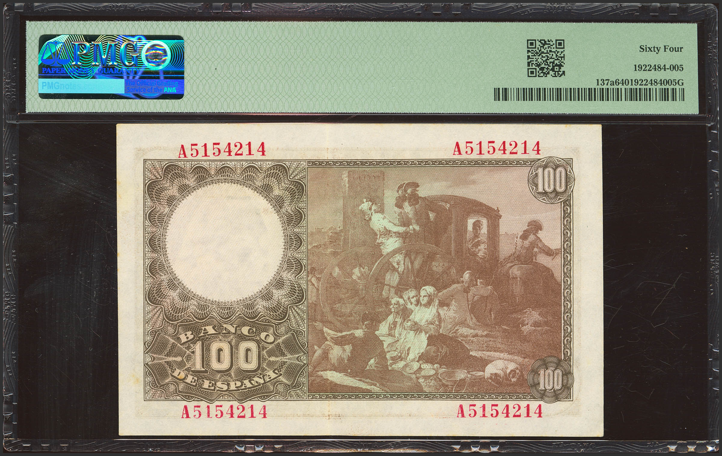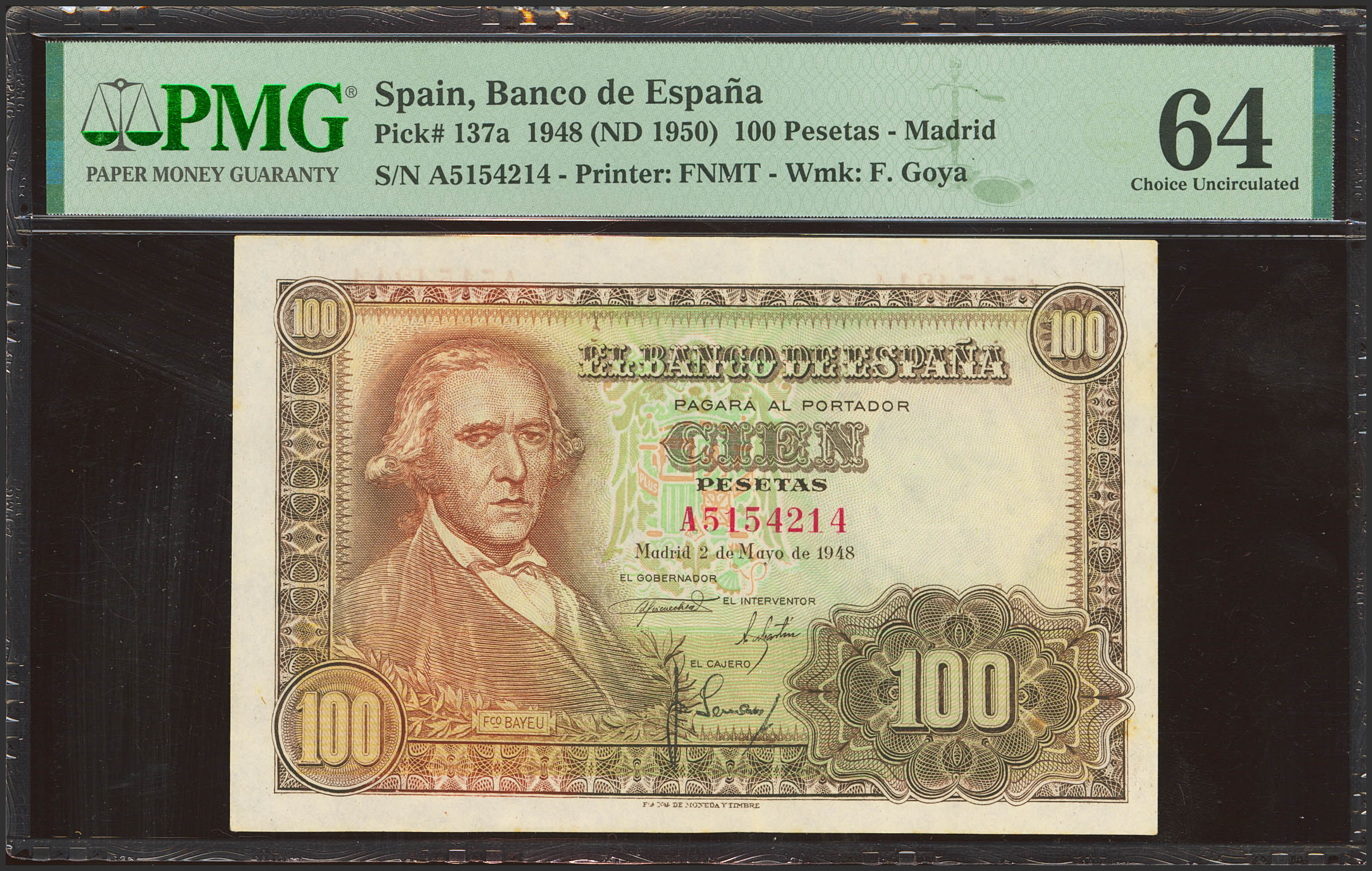 English 100 Pesetas. May 2, 1948. Series A. (Edifil 2023: 456a, Pick: 137a). Uncirculated. PMG64 encapsulated.