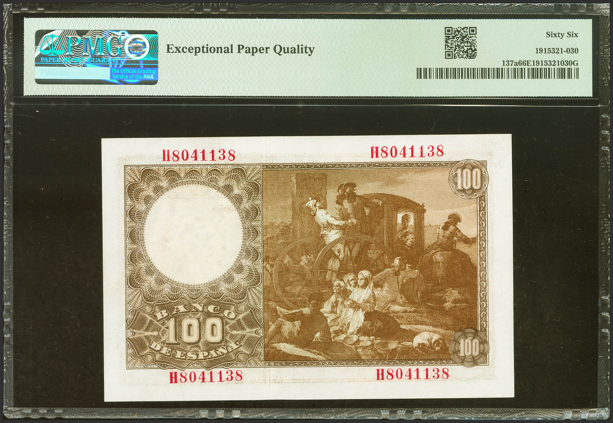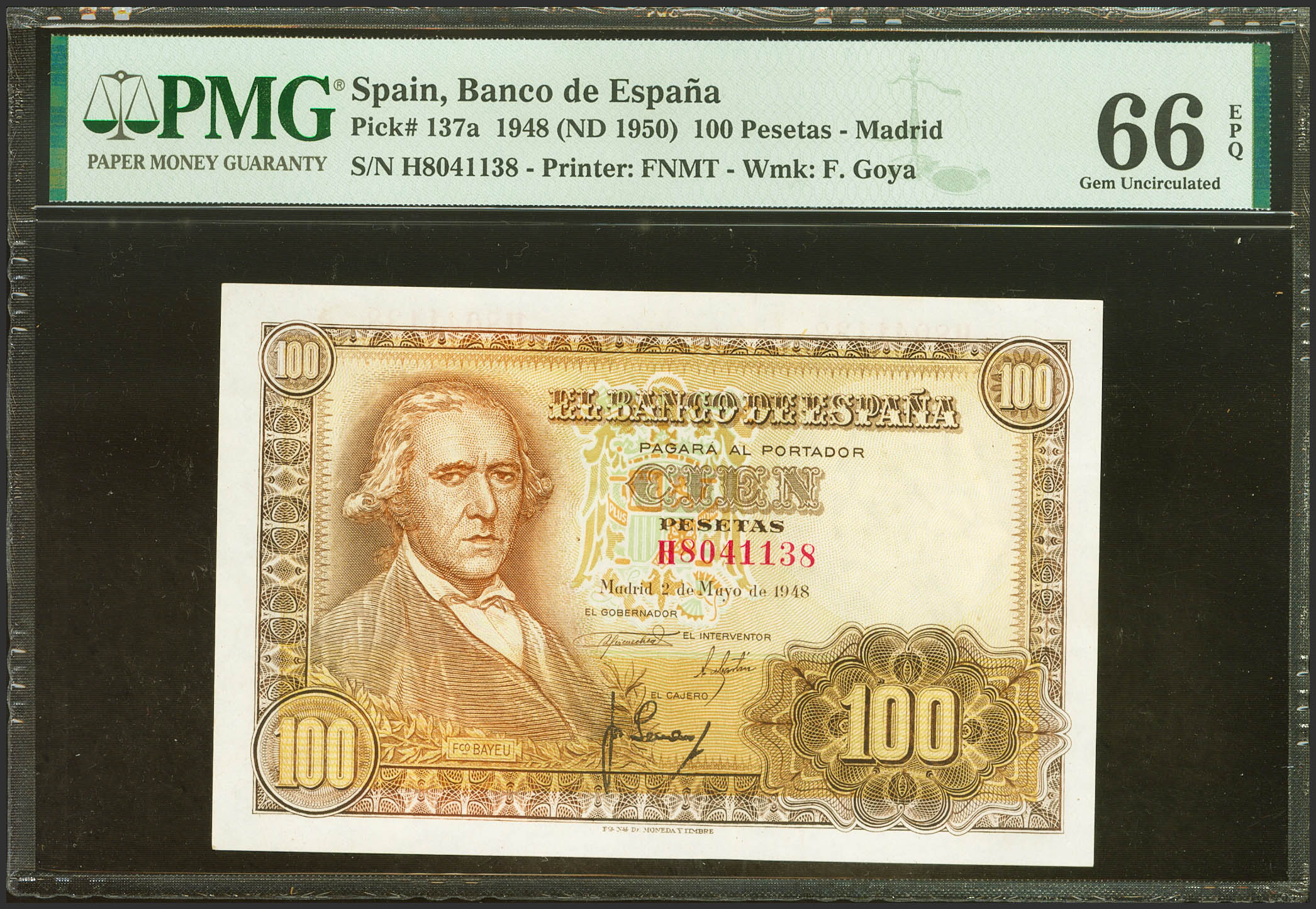 English 100 Pesetas. May 2, 1948. Series H. (Edifil 2023: 456a, Pick: 137a). Unusual in this exceptional quality, original finish. Uncirculated. PMG66EPQ capsule.
