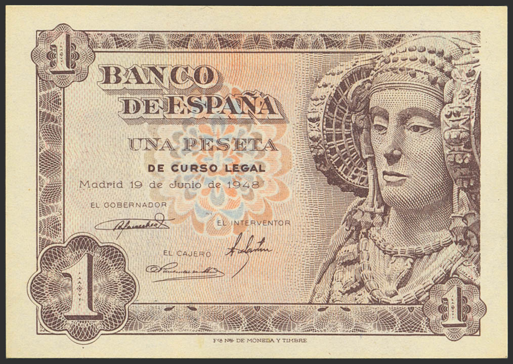 English 1 Peseta. June 19, 1948. Series O, last series issued. (Edifil 2023: 457b). Original condition. Uncirculated-.