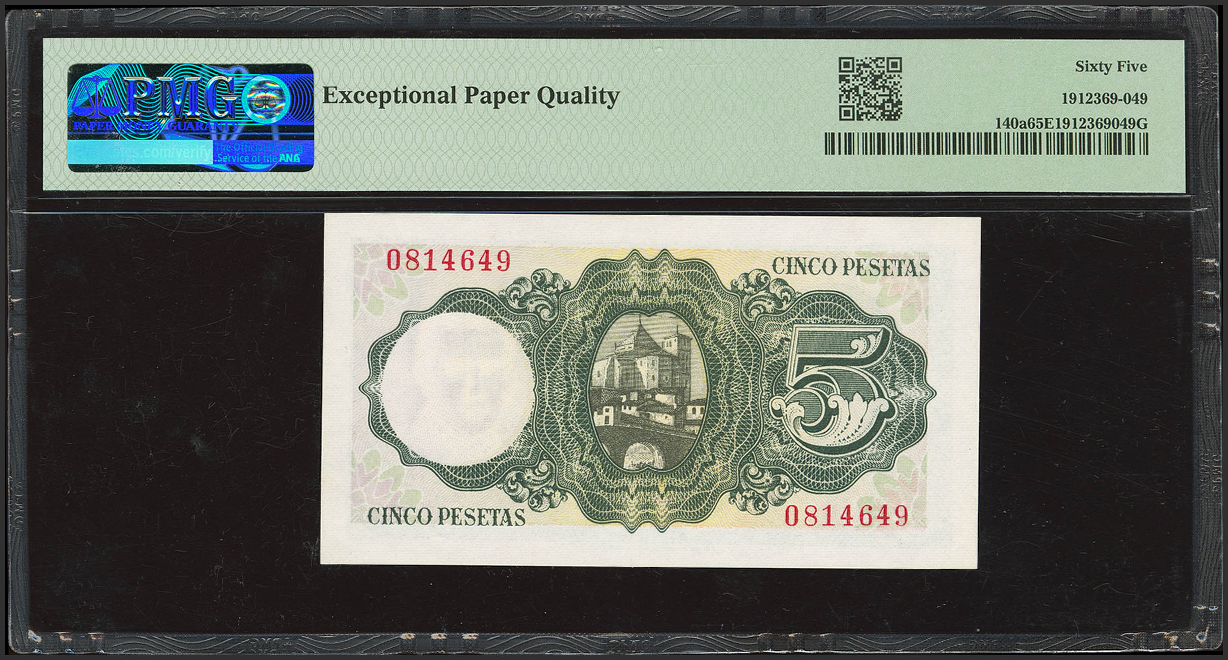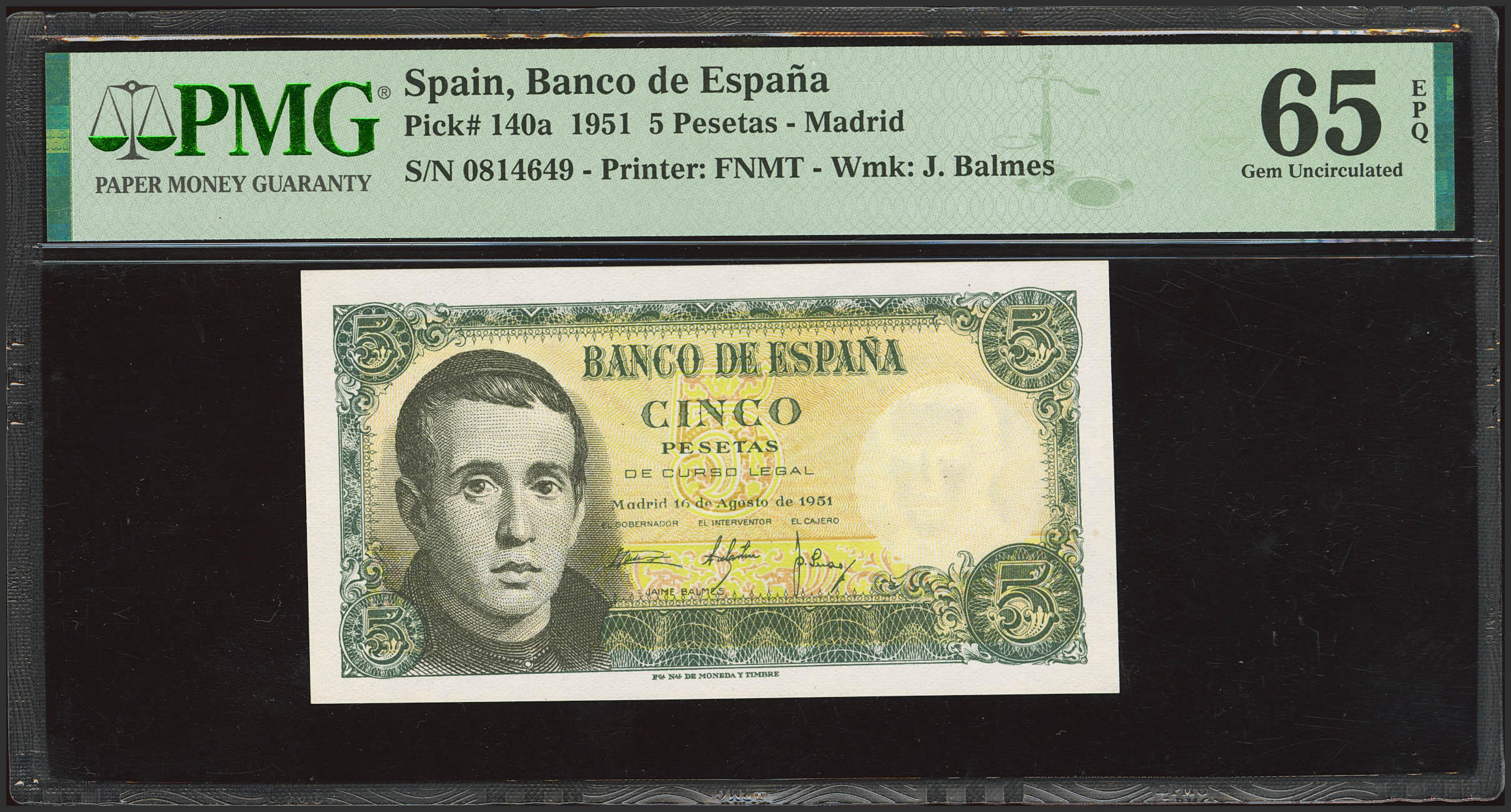 5 Pesetas. August 16, 1951. No serial number. (Edifil 2023: 459, Pick: 140a). Original finish. Uncirculated. PMG65EPQ encapsulation.