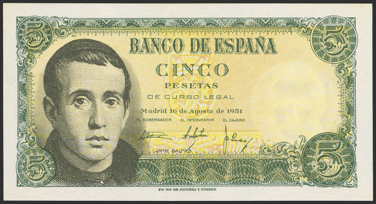 5 Pesetas. August 16, 1951. Series A. (Edifil 2023: 459a). Original finish. Uncirculated-.