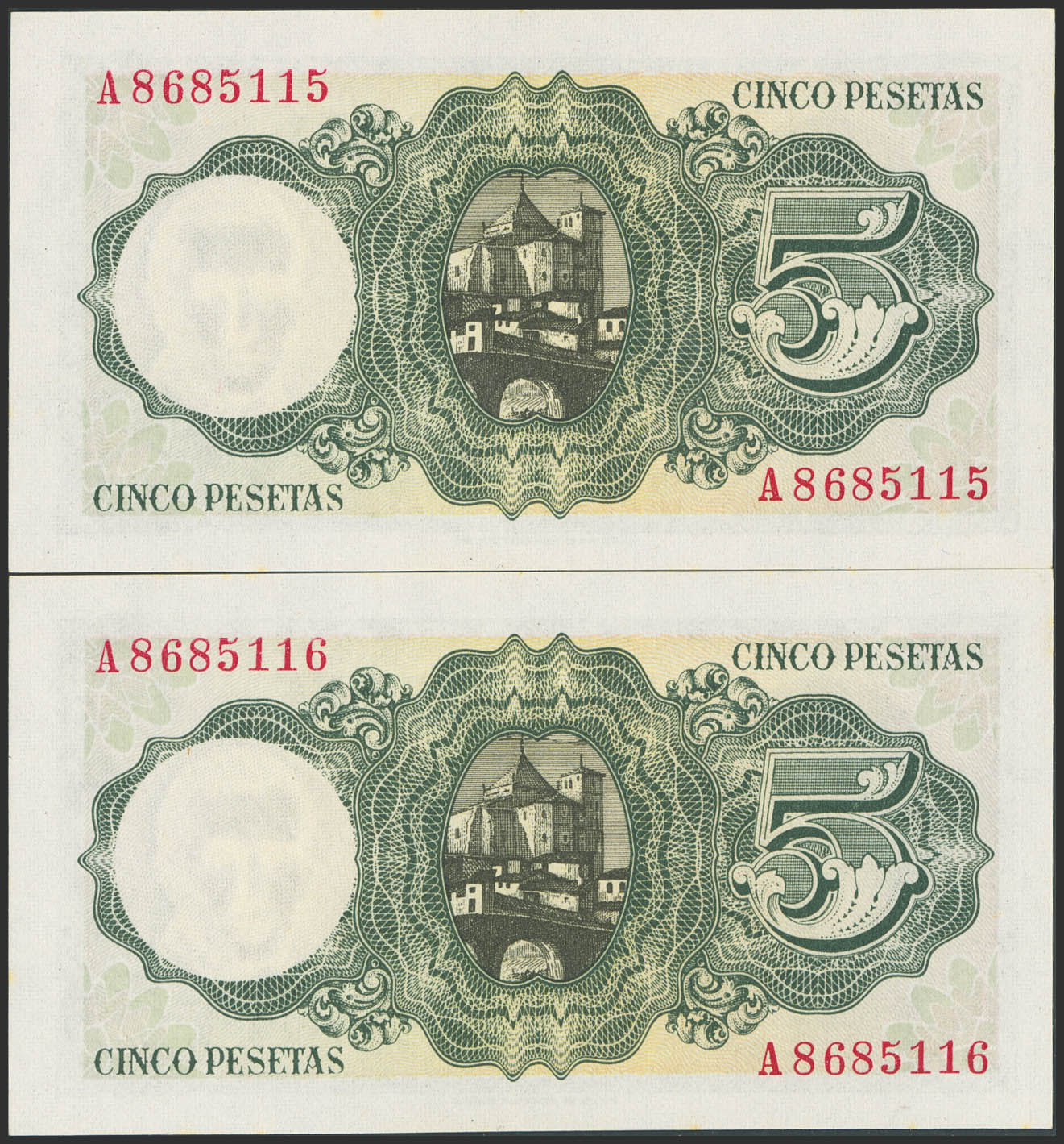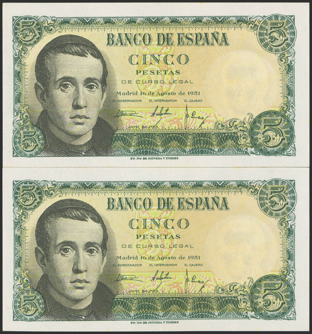 English 5 Pesetas. August 16, 1951. Consecutive pair. Series A. (Edifil 2023: 459a). Original finish. Uncirculated.