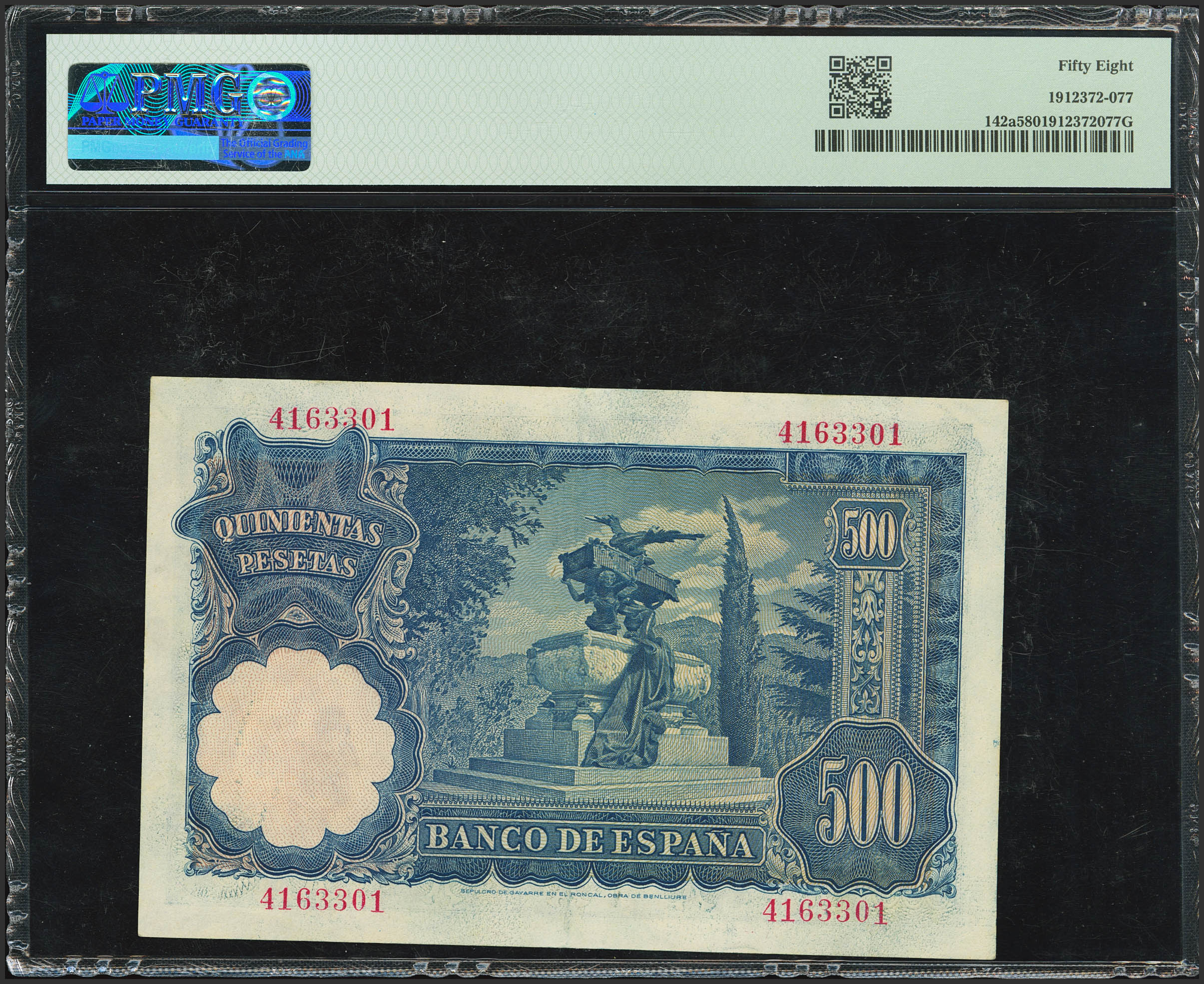 English 500 Pesetas. November 15, 1951. No serial number. (Edifil 2023: 460, Pick: 142a). Good Extremely Fine+. PMG58 package.