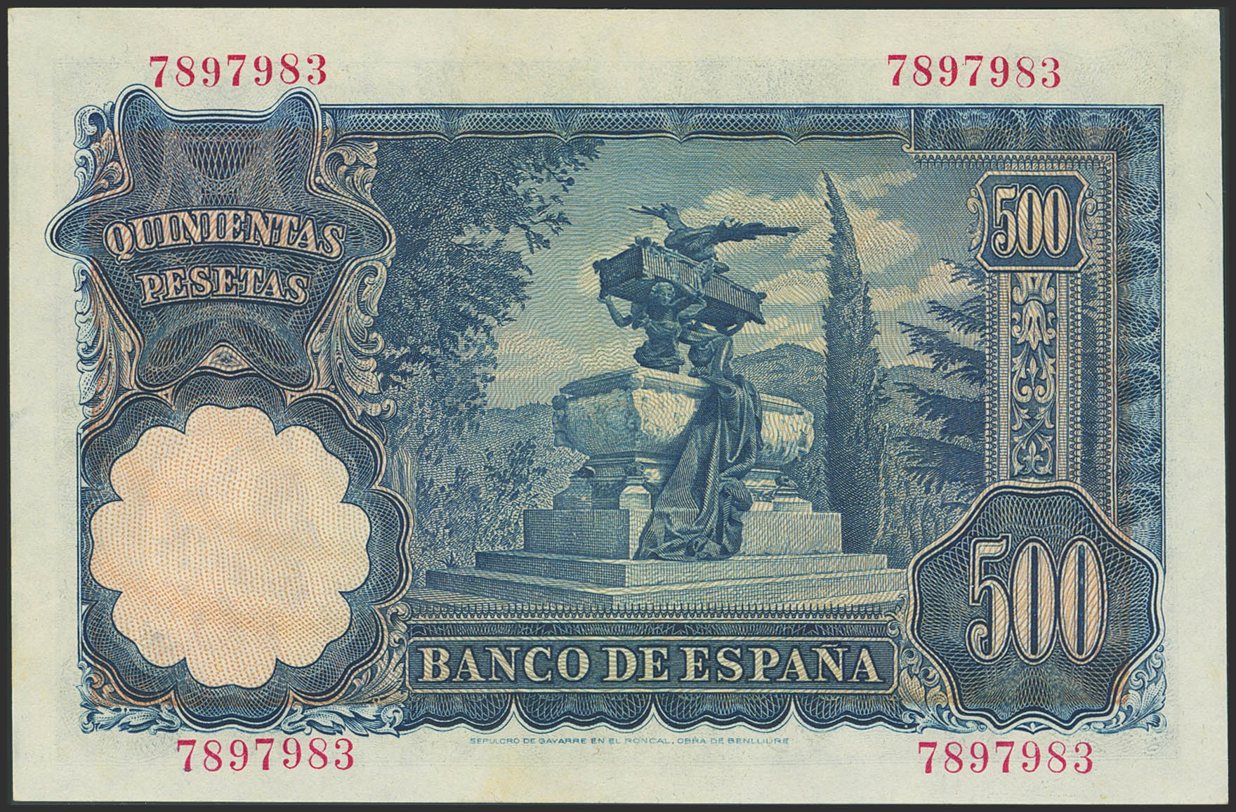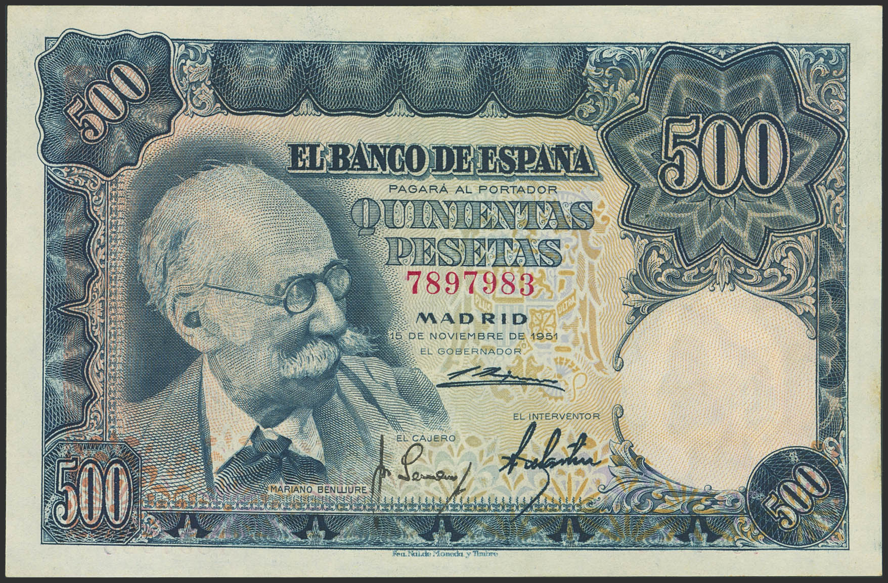 English 500 Pesetas. November 15, 1951. No series. (Edifil 2023: 460). Retains much of its original finish. EF+.