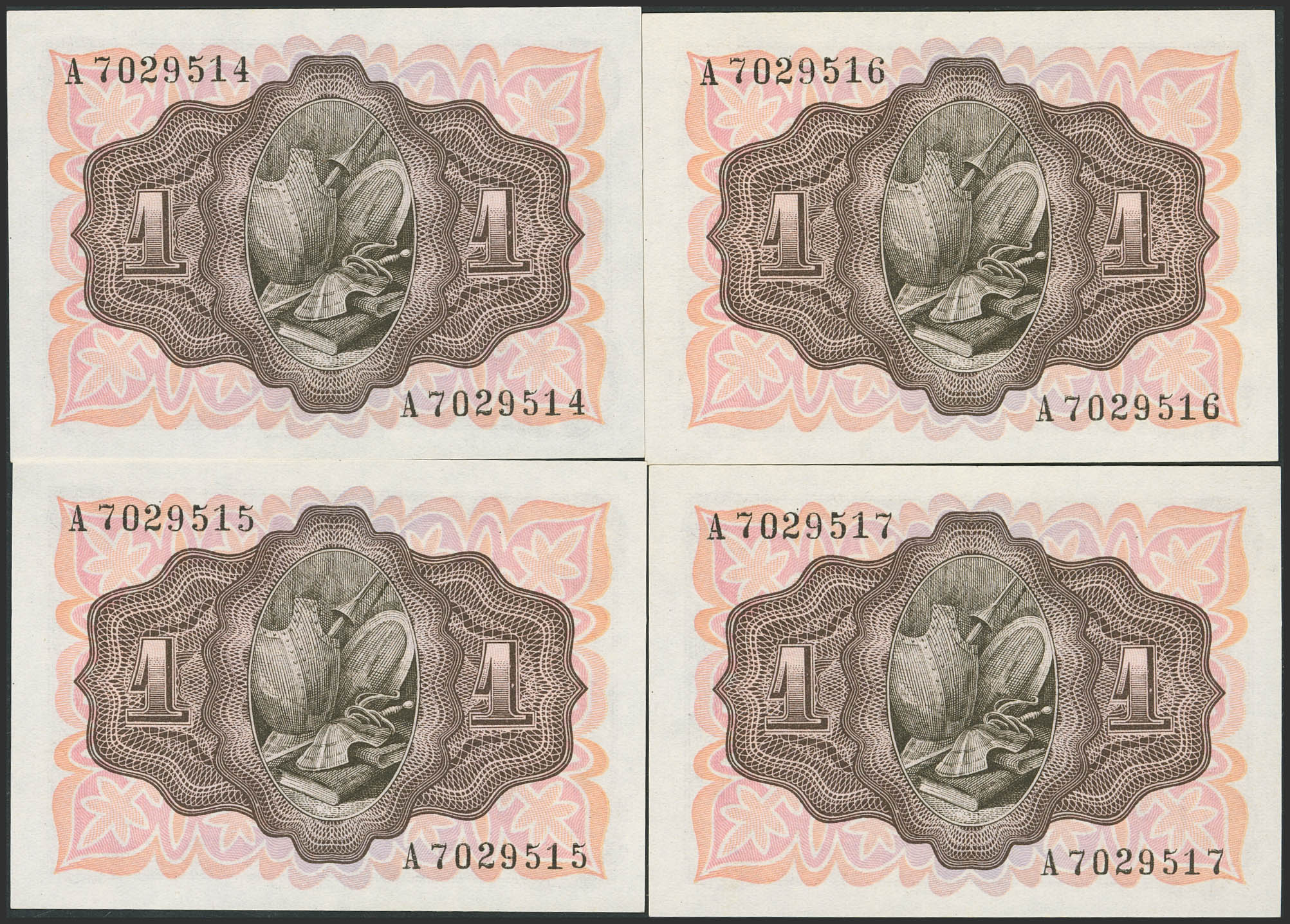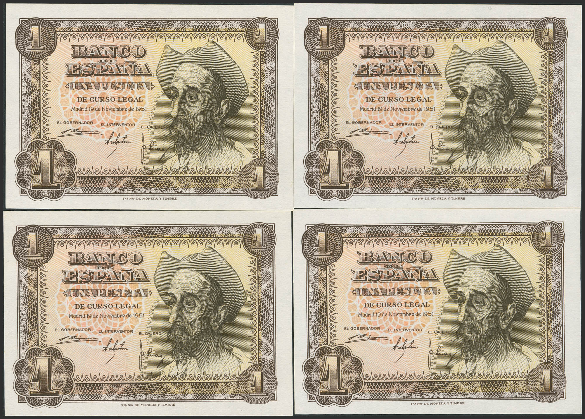 Set of 4 consecutive 1 Peseta banknotes issued on November 19, 1951, with series A. (Edifil 2023: 461a). Uncirculated.