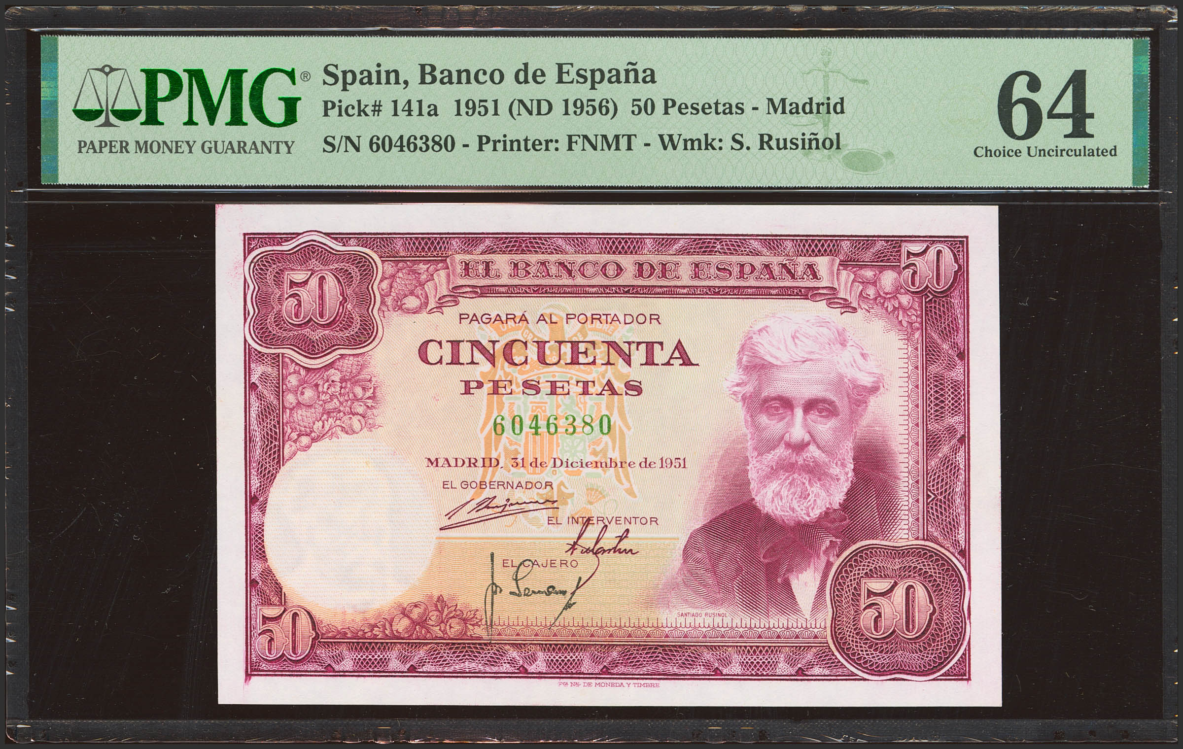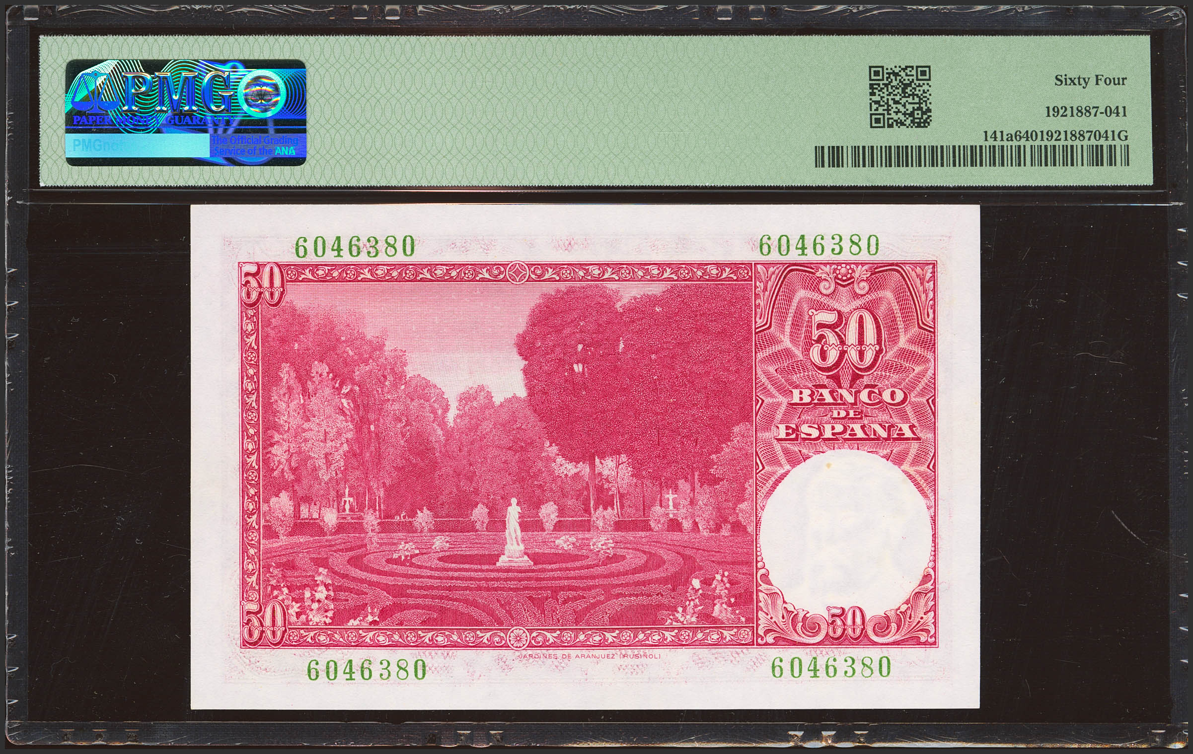 50 Pesetas. December 31, 1951. No serial number. (Edifil 2023: 462, Pick: 141a). Uncirculated. PMG64 package.