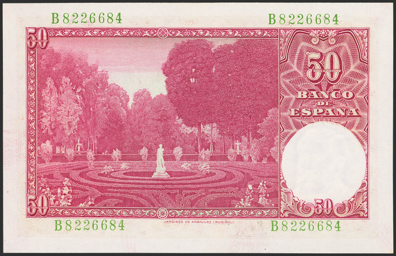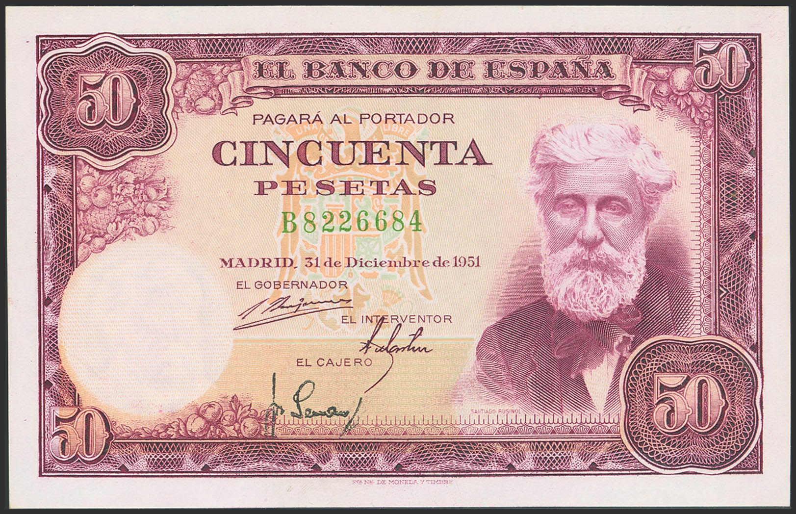 50 Pesetas. December 31, 1951. Series B. (Edifil 2023: 462a). Original finish. Uncirculated.
