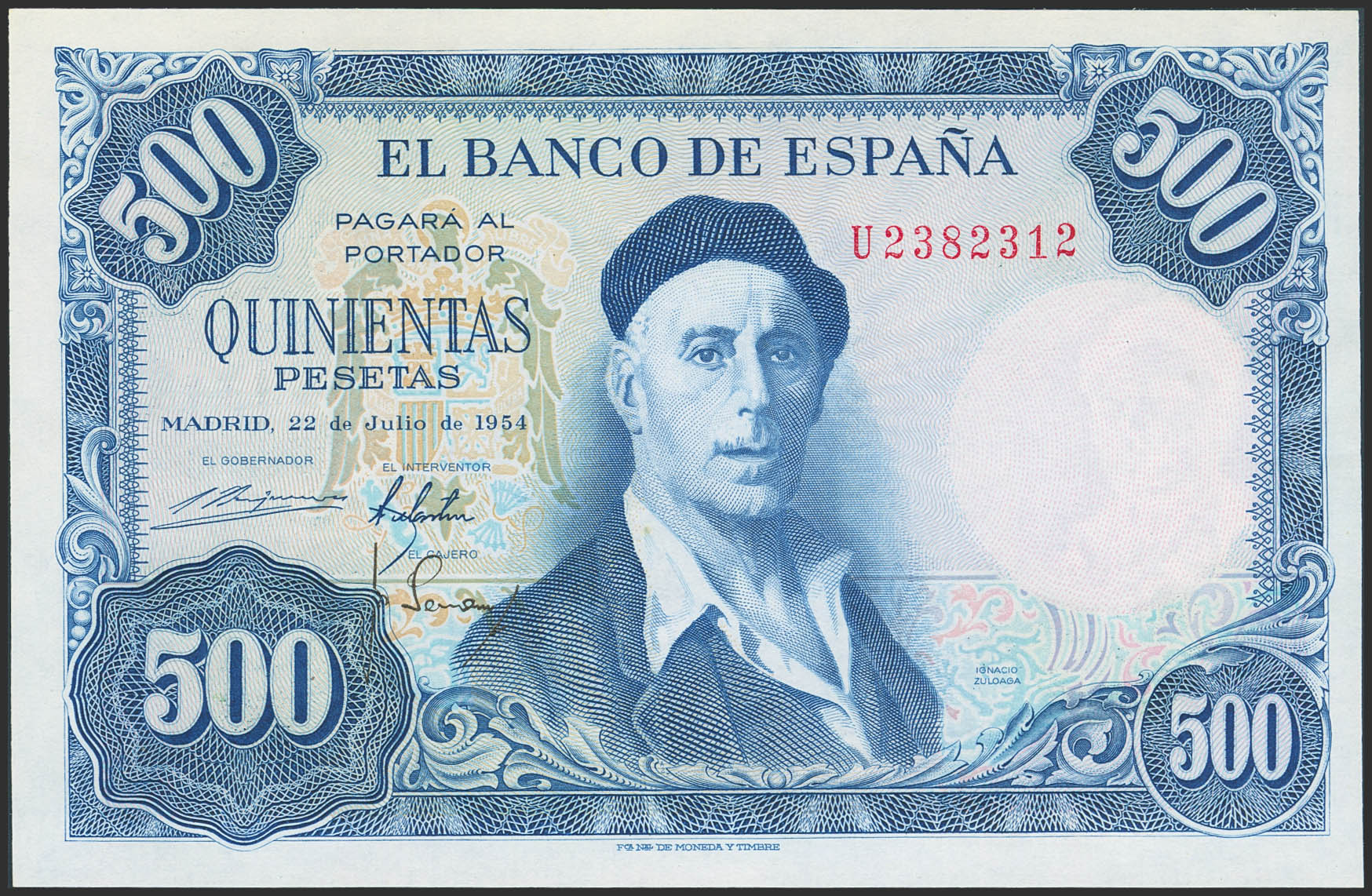 English 500 Pesetas. July 22, 1954. Series U. (Edifil 2023: 468b). Retains all its original finish. Uncirculated.