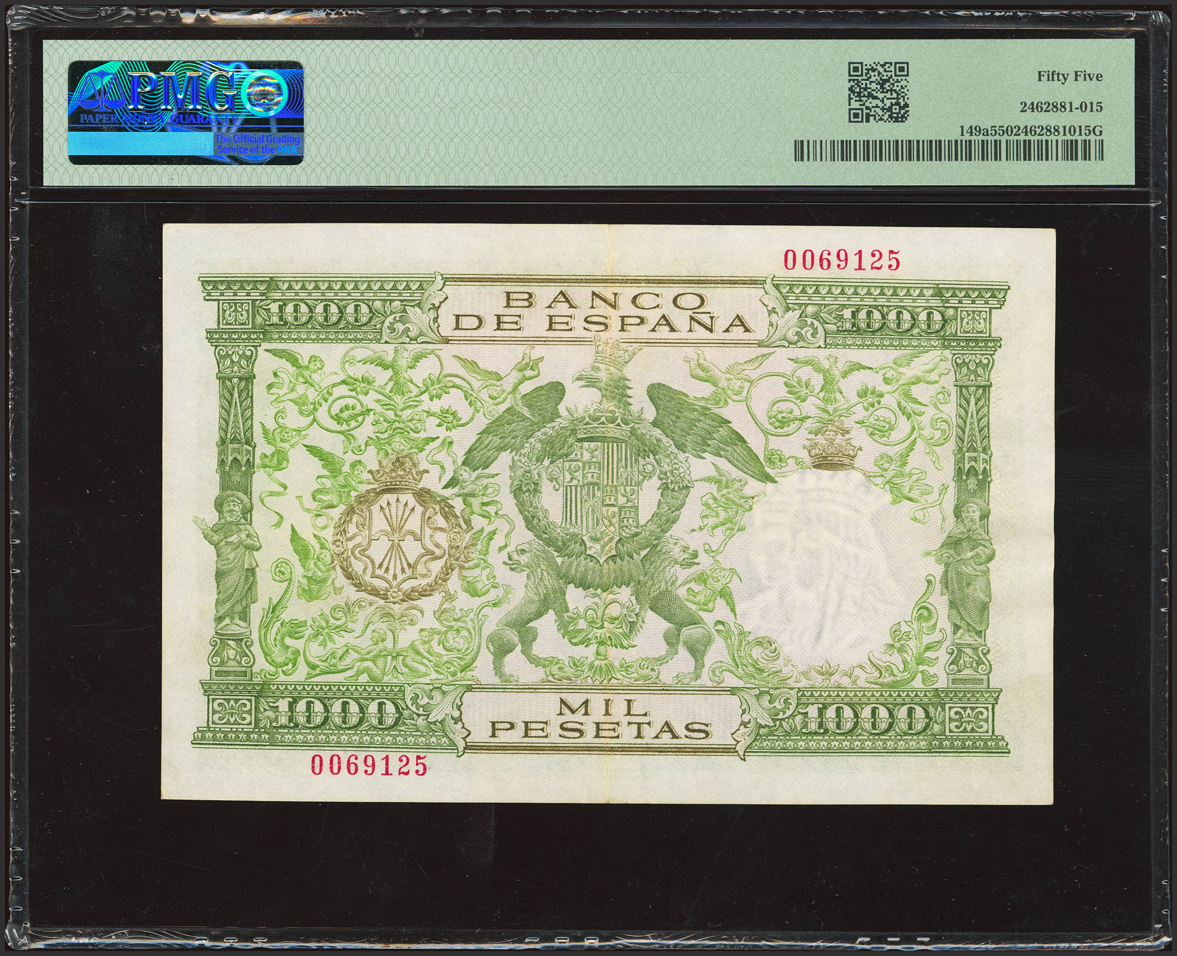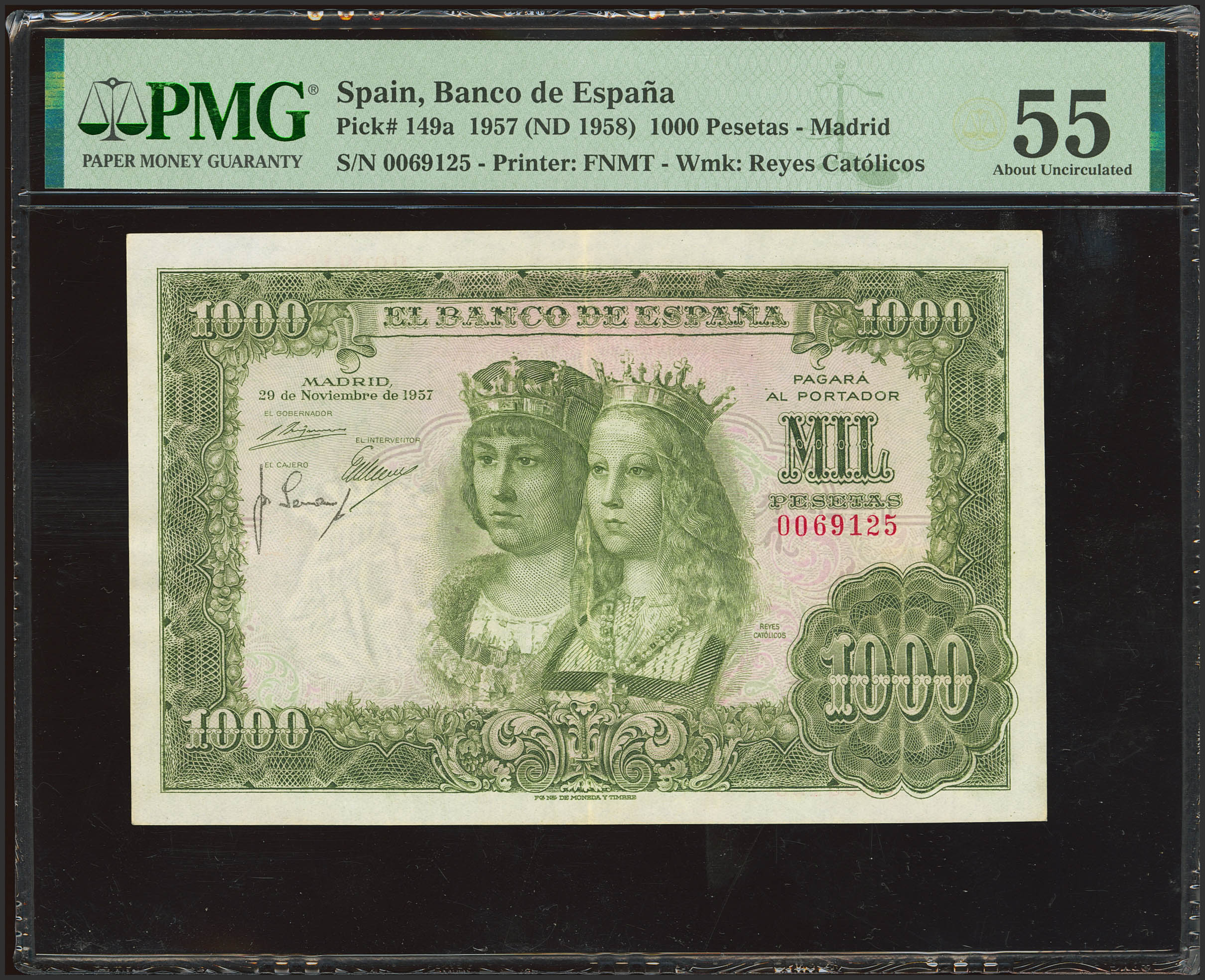 English 1000 Pesetas. November 29, 1957. No serial number and low serial number. (Edifil 2023: 469, Pick: 149a). EF+. PMG55 package.