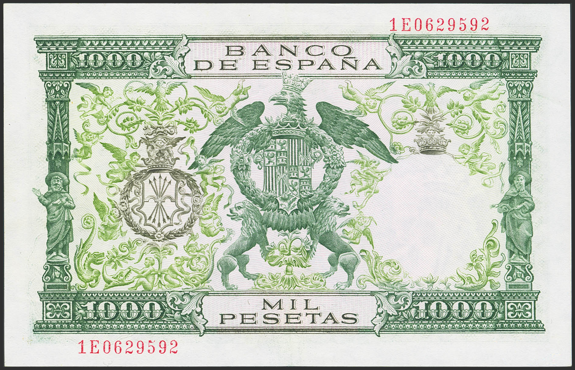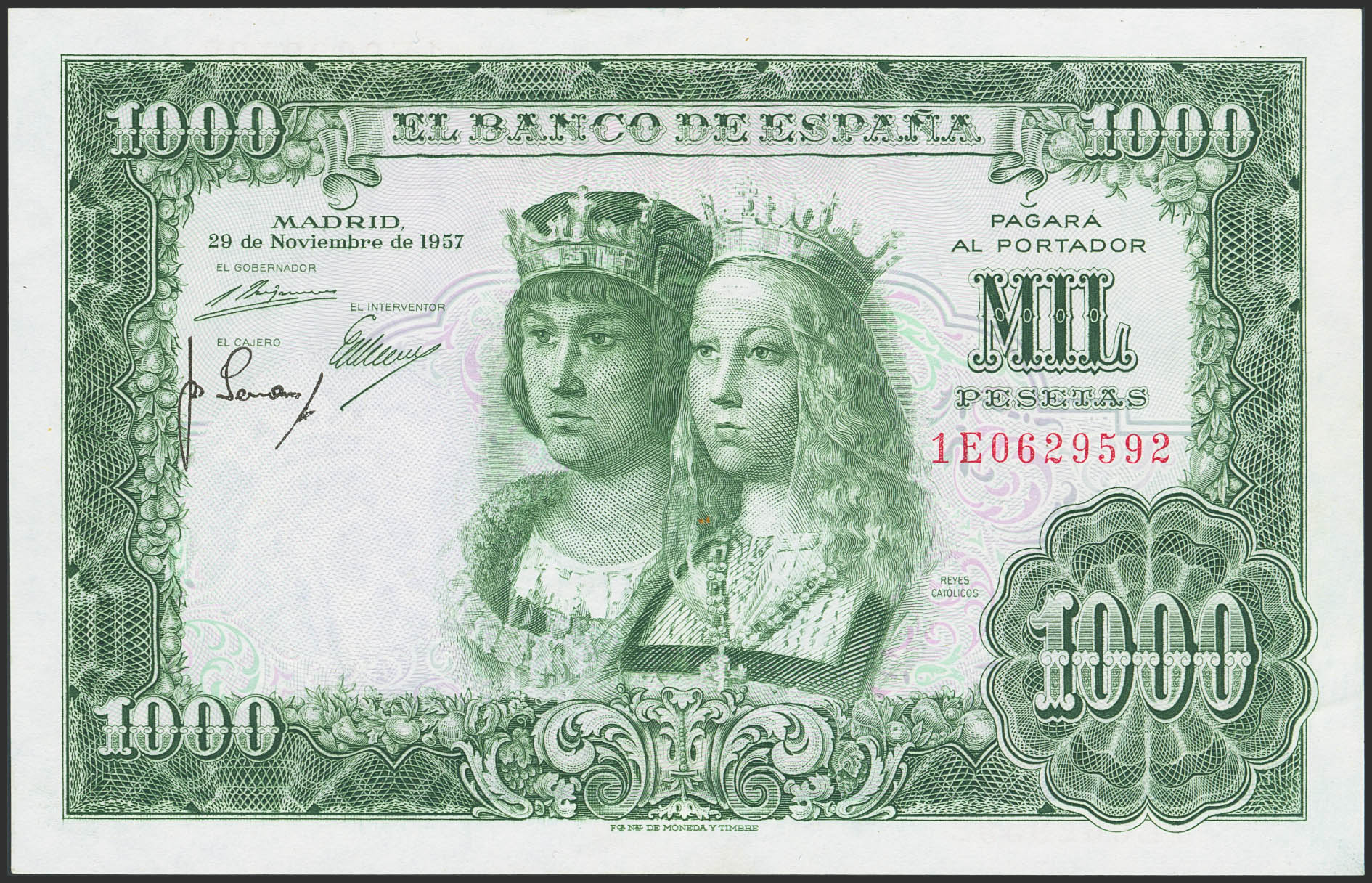 English 1000 Pesetas. November 29, 1957. Series 1E. (Edifil 2023: 469b). Retains much of its original finish. EF+.