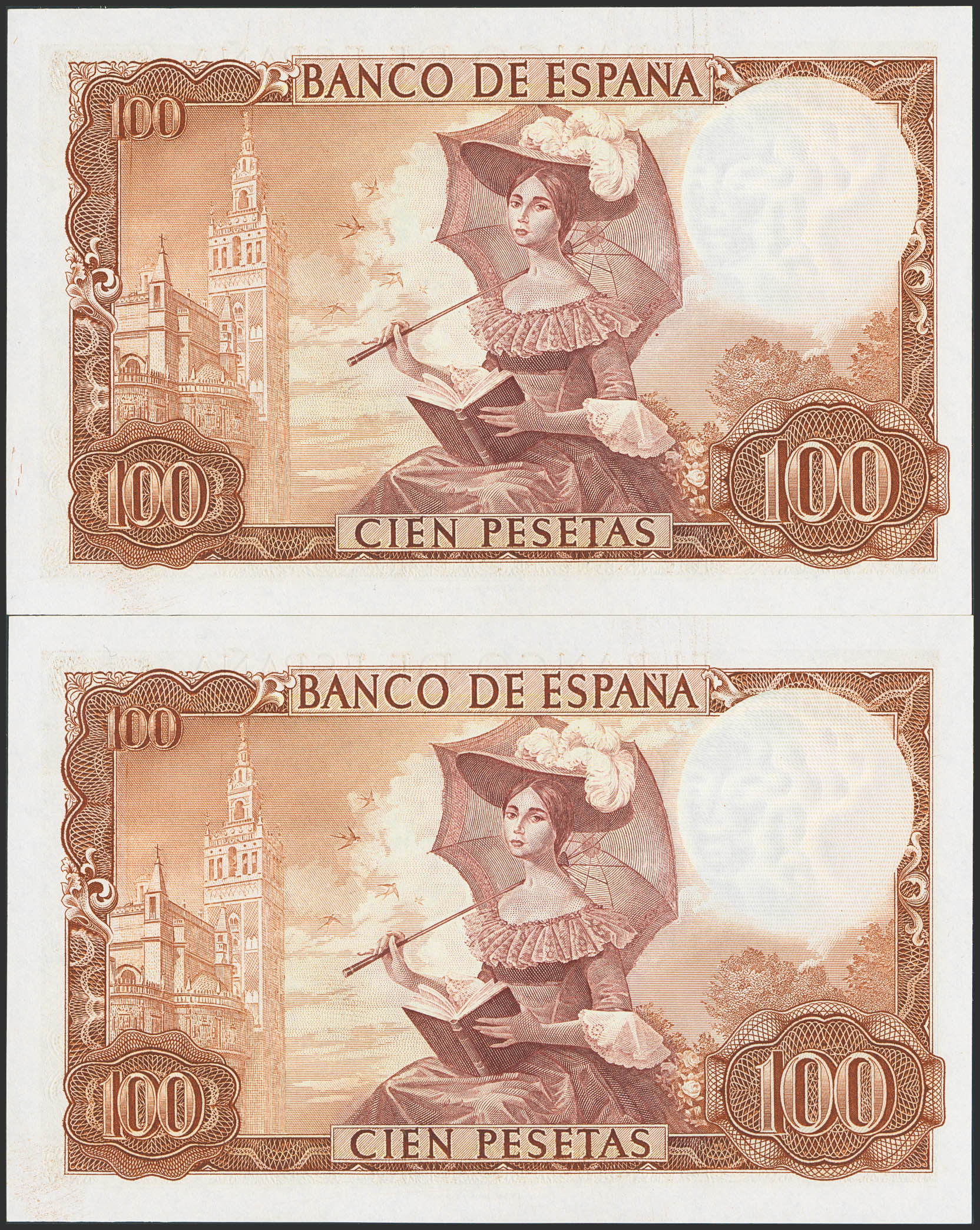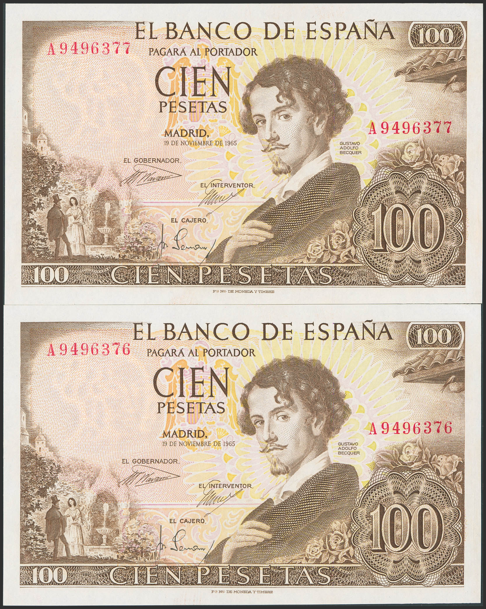 English 100 Pesetas. November 19, 1965. Consecutive pair. Series A. (Edifil 2023: 470a). Original finish. Uncirculated.