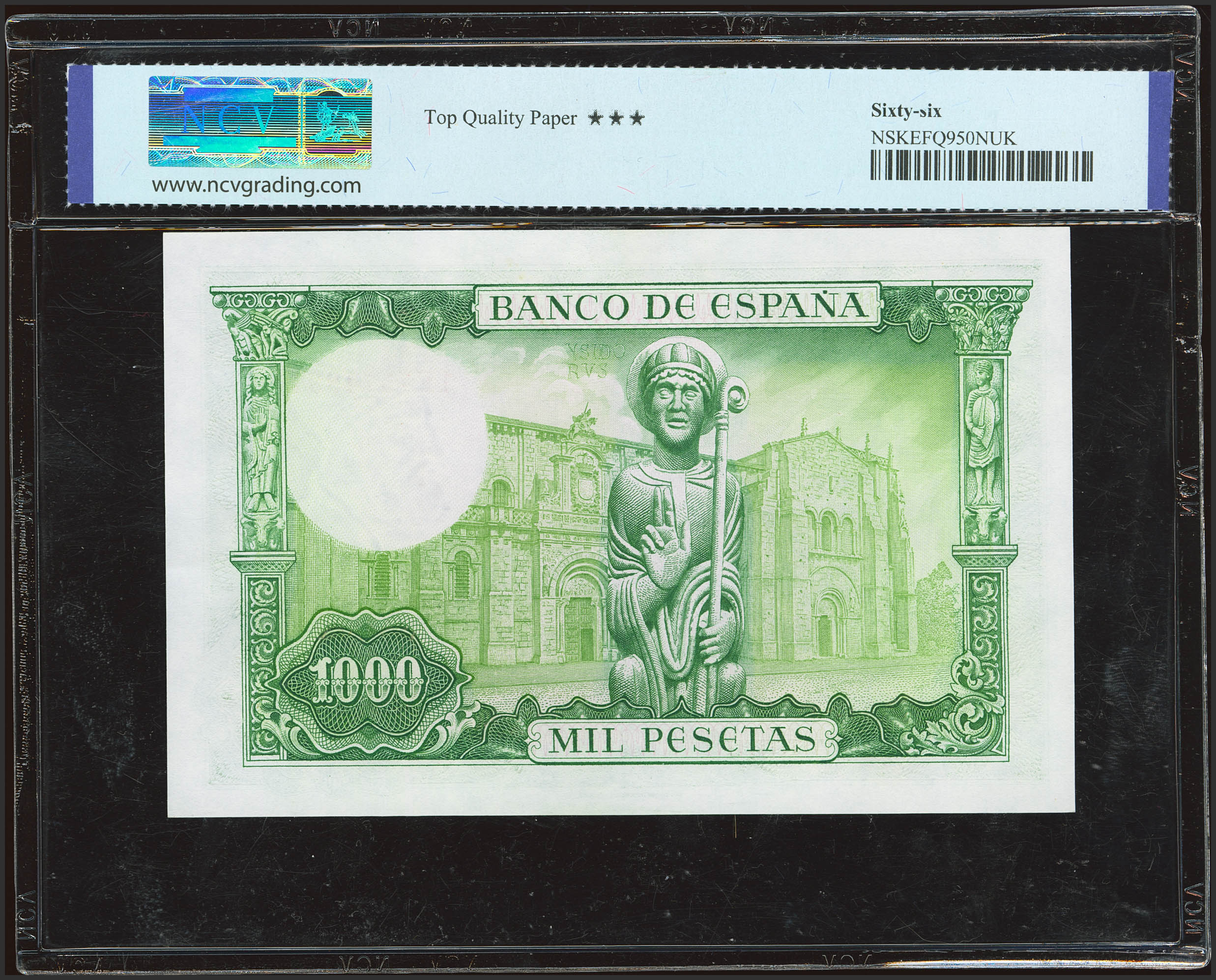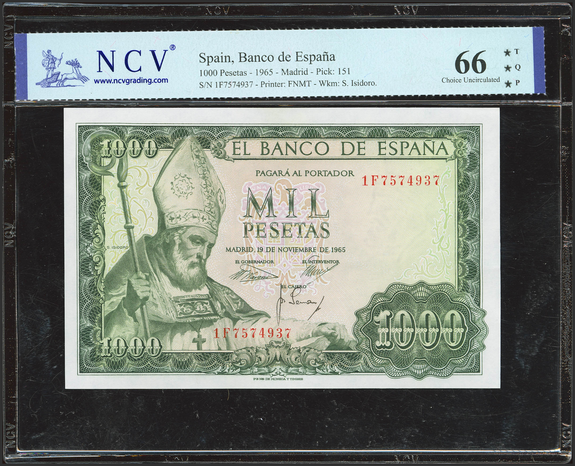 English 1000 Pesetas. November 19, 1965. Series 1F. (Edifil 2023: 471b, Pick: 151). Original finish. Uncirculated. NCV66TPQ package.