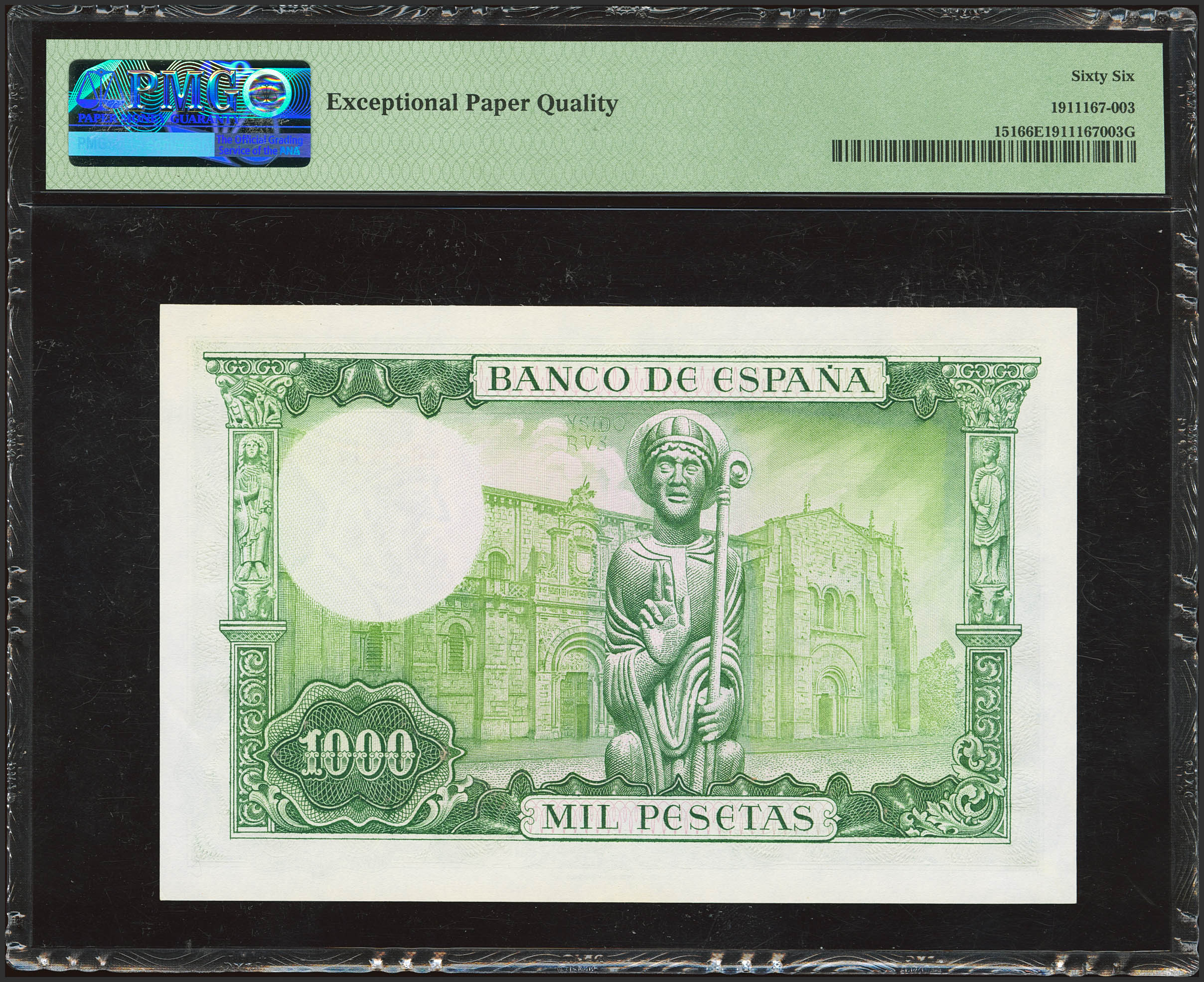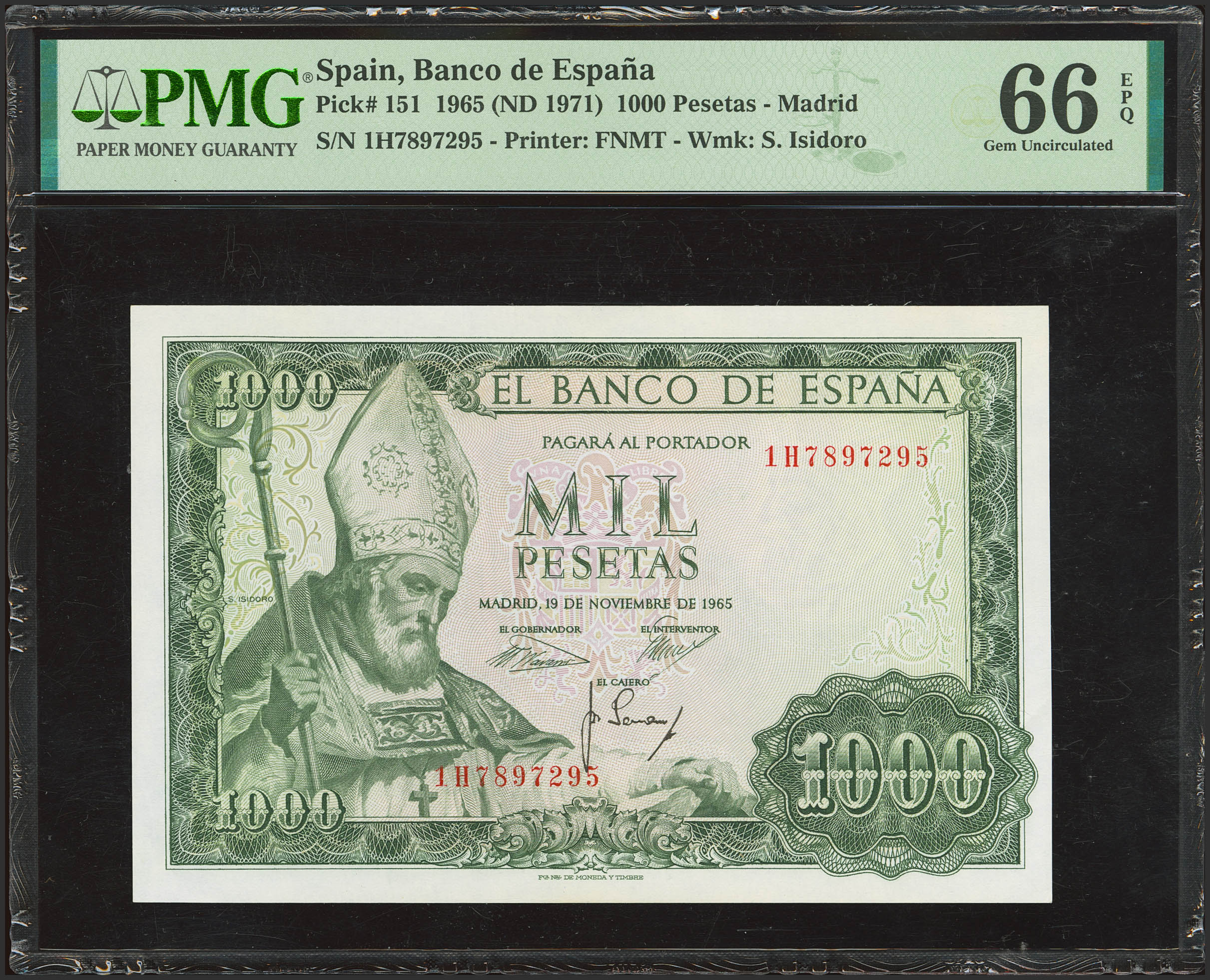 English 1000 Pesetas. November 19, 1965. Series 1H. (Edifil 2023: 471b, Pick: 151). Original finish. Uncirculated. PMG66EPQ encapsulation.