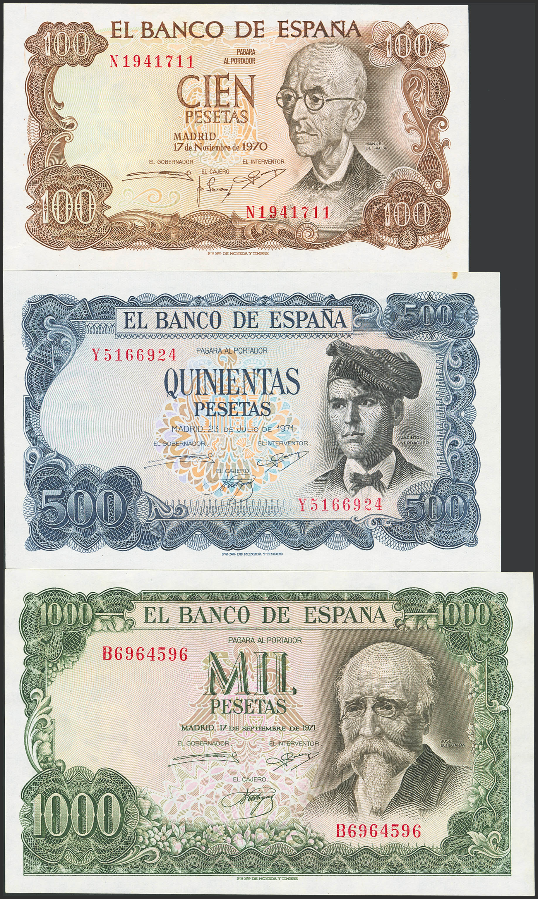 Set of 3 Bank of Spain banknotes of 100 Pesetas, 500 Pesetas and 1000 Pesetas, issued between 1970 and 1971, with series N, Y and B. (Edifil 2023: 472b, 473a and 474b). Uncirculated/Uncirculated--.