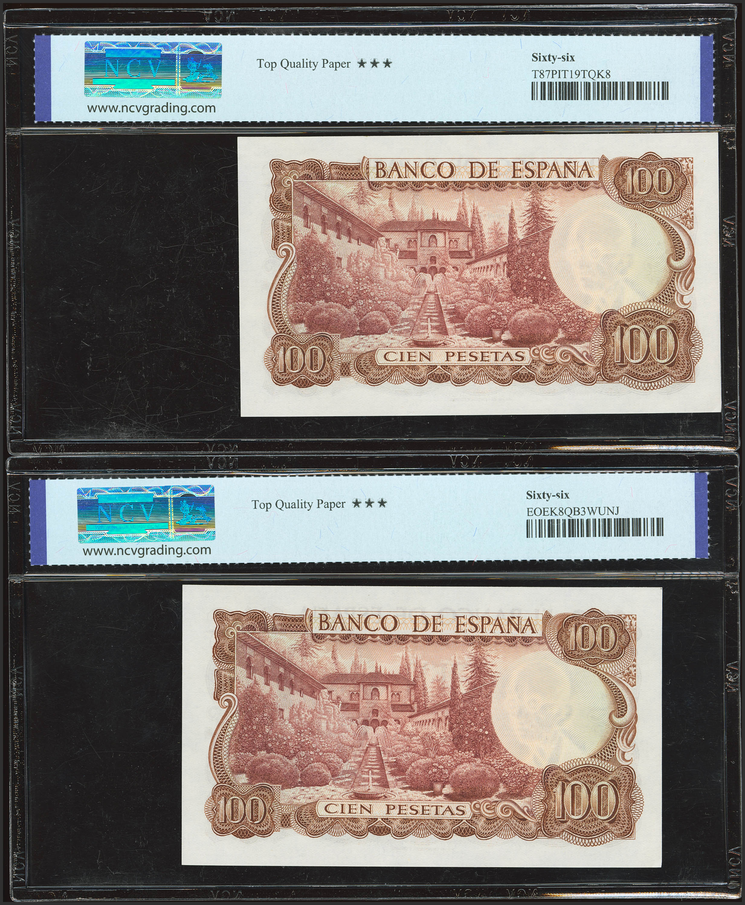 100 Pesetas. November 17, 1970. Consecutive pair. Special series 9A. (Edifil 2023: 472d, Pick: 152a*). Original finish. Uncirculated. NCV66TPQ capsules, both.