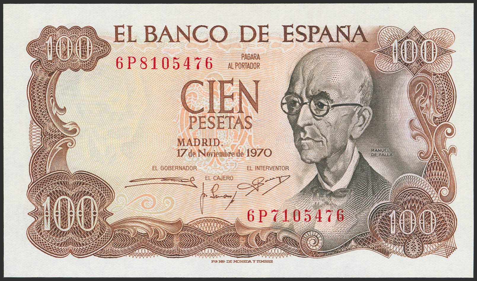100 Pesetas. November 19, 1970. Series 6P with an error in the serial numbers. (Edifil 2023: 472b). Very rare and in original condition. Uncirculated.