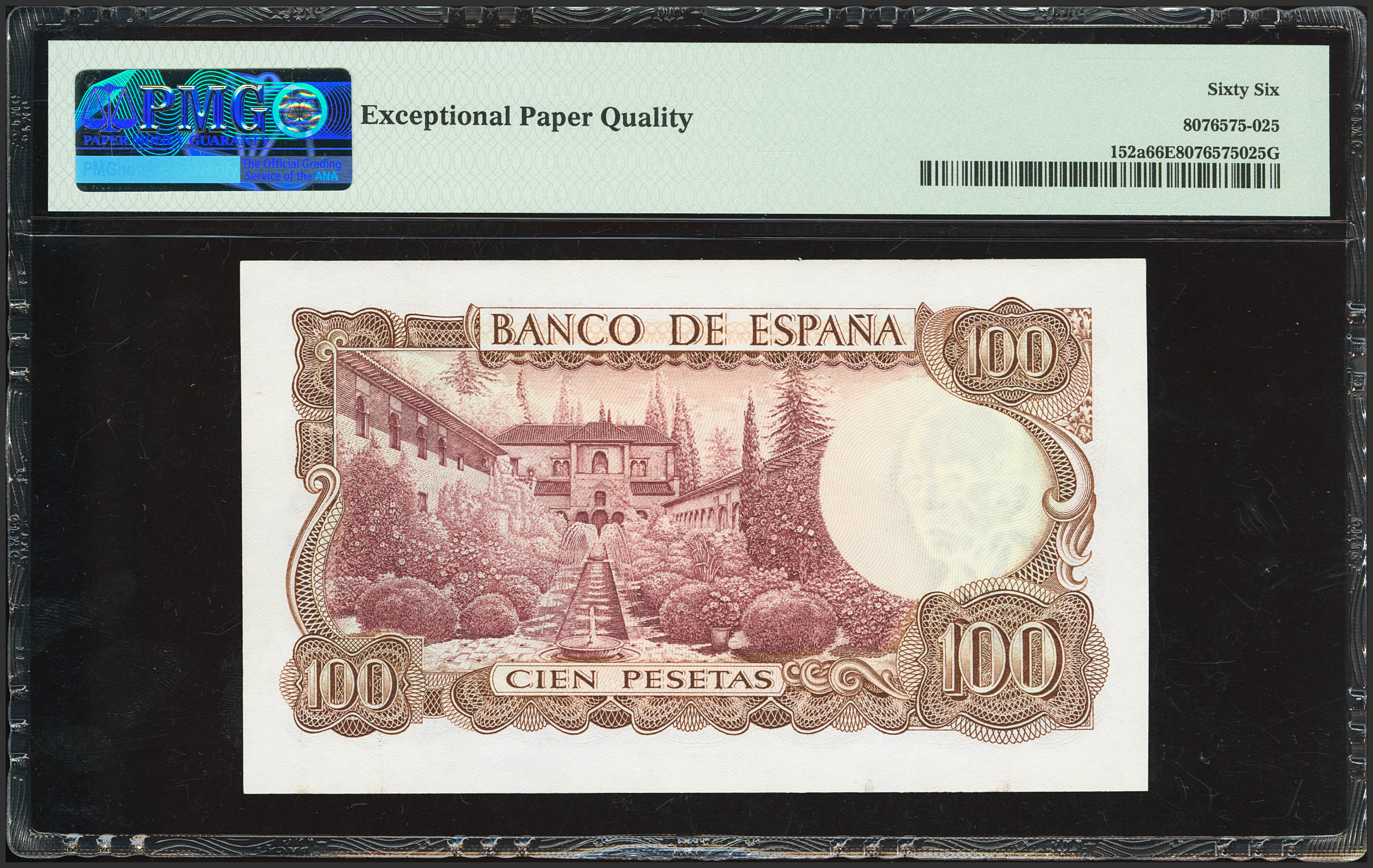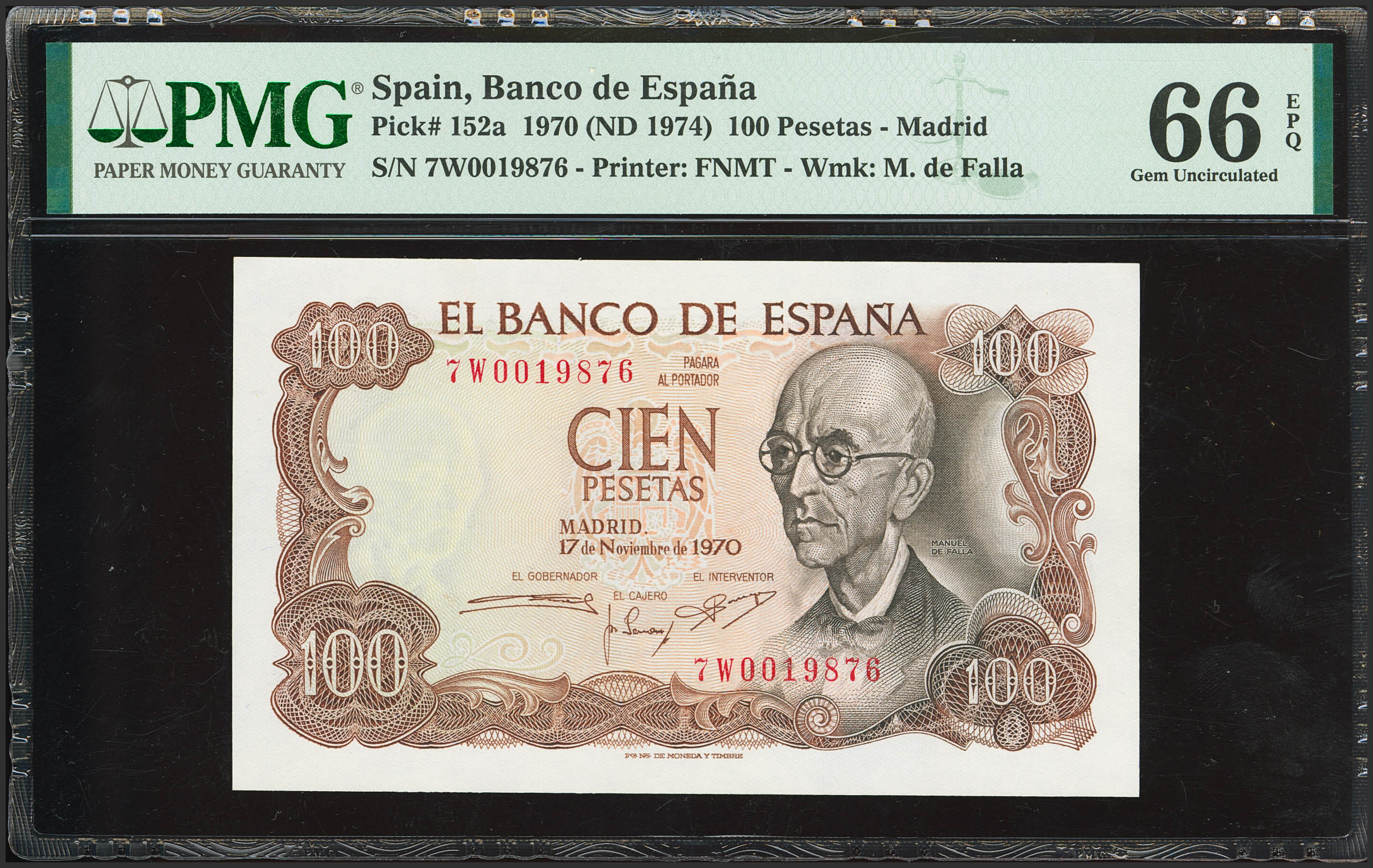 100 Pesetas. November 17, 1970. Series 7W, last series issued. (Edifil 2023: 472c, Pick: 152a). Original finish. Uncirculated. PMG66EPQ capsule.